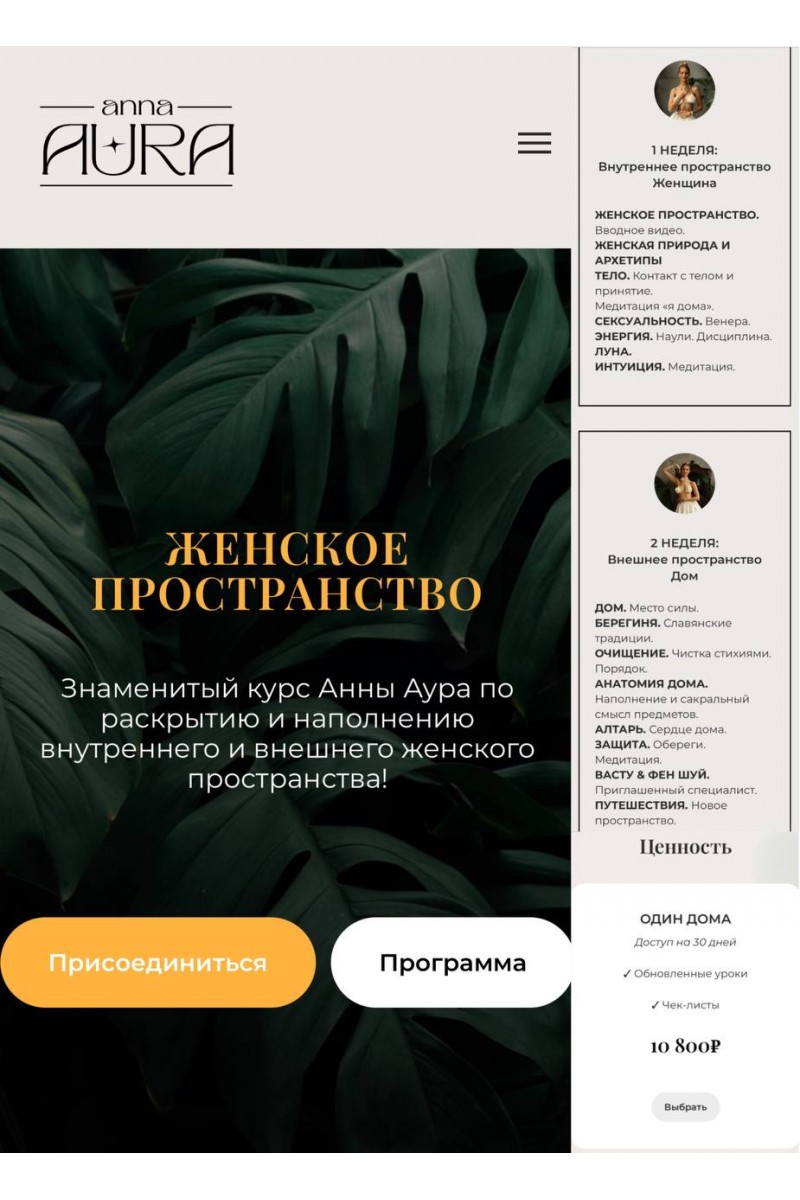 Знаменитый курс Анны Аура по раскрытию и наполнению внутреннего и внешнего женского пространства!С чем сейчас сталкиваются женщины:✗ Отсутствие вдохновения и энергии✗ Эмоциональная и физическая усталость✗ Подавленность и тревога✗ Непонимание планов и отсутствие стабильности✗ Выгорание и апатия✗ Нет времени на себя или нет желания✗ Частые переезды и путешествия✗ Нет собственного пространстваКурс поделен на 2 модуля с уроками по теме. Индивидуальные задания.1 НЕДЕЛЯ: Внутреннее пространство - ЖенщинаЖЕНСКОЕ ПРОСТРАНСТВО. Вводное видео.ЖЕНСКАЯ ПРИРОДА И АРХЕТИПЫТЕЛО. Контакт с телом и принятие. Медитация «я дома».СЕКСУАЛЬНОСТЬ. Венера.ЭНЕРГИЯ. Наули. Дисциплина.ЛУНА.ИНТУИЦИЯ. Медитация.2 НЕДЕЛЯ: Внешнее пространство - ДомДОМ. Место силы.БЕРЕГИНЯ. Славянские традиции.ОЧИЩЕНИЕ. Чистка стихиями. Порядок.АНАТОМИЯ ДОМА. Наполнение и сакральный смысл предметов.АЛТАРЬ. Сердце дома.ЗАЩИТА. Обереги. Медитация.ВАСТУ & ФЕН ШУЙ. Приглашенный специалист.ПУТЕШЕСТВИЯ. Новое пространство.