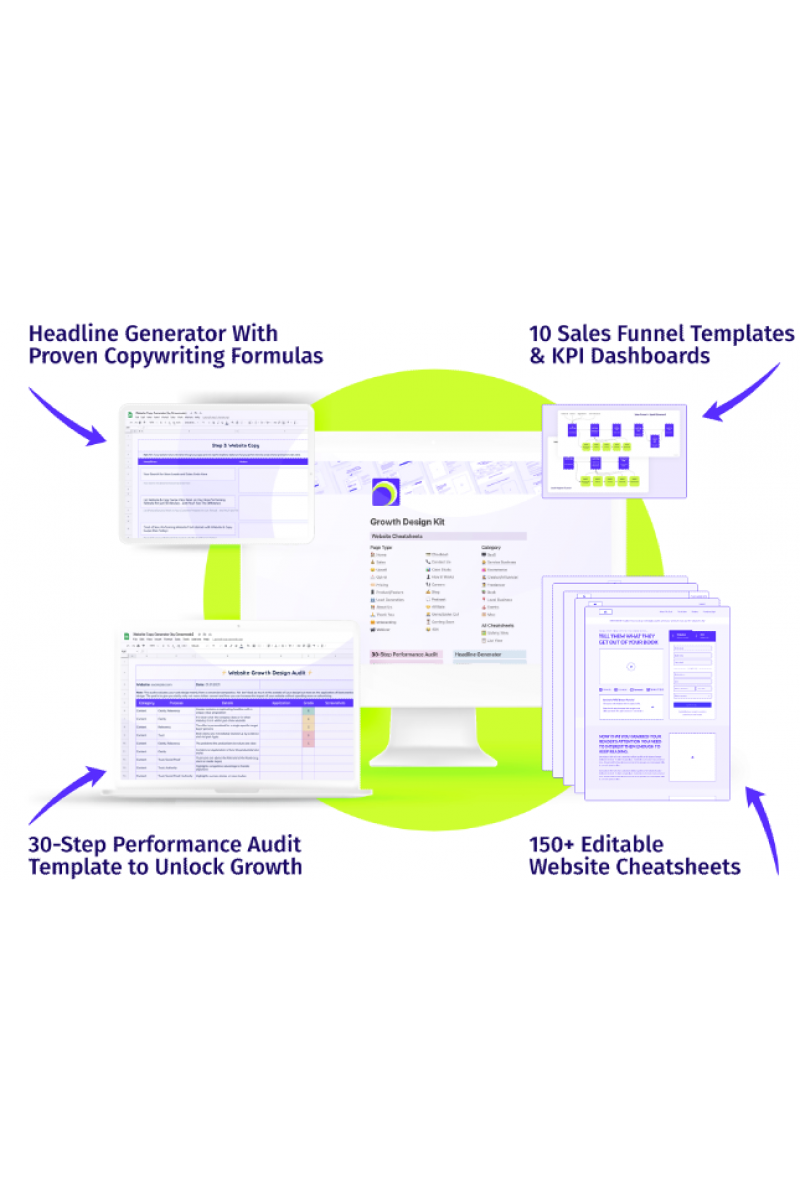 Если вы умеете копировать и вставлять, то вы тоже сможете создавать сайты, которые конвертируют!Получите мгновенный доступ к более чем 150 редактируемым шпаргалкам по веб-сайтам, имитирующим некоторые из самых успешных страниц в Интернете, которые позволят вам превратить любой запыленный веб-сайт в канал роста №1!Устали тратить месяцы на создание веб-сайта, который не приводит к росту бизнеса?Вы когда-нибудь задавались вопросом, почему некоторые веб-сайты генерируют потенциальных клиентов и продают как часы, а другие стоят всего $$$? Комплект дизайна для роста представляет собой набор из более чем 150 шпаргалок по веб-сайтам и других инструментов, которые помогут вам спланировать редизайн веб-сайта, который принесет больше дохода, а не только красивые страницы.Сэкономьте часы работы , разработав надежную стратегию веб-дизайна за считанные минуты.Сократите расходы на проект веб-дизайна вдвое , создав четкие контуры страниц, прежде чем привлекать дизайнера или разработчика.Используйте проверенные фреймворки и учитесь у других успешных онлайн-компаний.Повысьте рентабельность инвестиций в редизайн вашего веб -сайта и превратите любой запыленный сайт-брошюру в маркетинговый инструмент №1.Узнайте о препятствиях на пути к конверсии, которые мешают вашему текущему сайту приносить больше дохода.Создавайте копии веб-сайтов в 10 раз быстрее с помощью генератора заголовков с функцией plug-and-play.Ускорьте свой рабочий процесс веб-дизайна и увеличьте свои результаты в 10 раз одновременно:Growth Design Kit — это набор инструментов, которые помогут вам быстро создавать ориентированные на рост веб-сайты и целевые страницы .1) 150+ редактируемых шпаргалок по веб-сайтам (Adobe XD + Figma)Точно узнайте, как структурировать каждую страницу на своем веб-сайте, используя свою библиотеку проверенных макетов веб-сайтов, включая рекомендации по содержанию для повышения конверсии и лучшего взаимодействия с пользователем. Не знаете, как использовать Adobe XD или Figma? Не беспокойтесь, мы покажем вам, как его использовать2) 10 шаблонов воронки продаж и информационных панелей KPI (PDF + Google Sheets)Если вы хотите масштабировать свой онлайн-бизнес и проводить прибыльные рекламные кампании, вам нужна работающая воронка продаж. Учитесь на проверенных потоках воронки для любого типа предложения и узнайте, насколько высоким должен быть ваш коэффициент конверсии, чтобы достичь следующей вехи дохода.3) Генератор заголовков с проверенными формулами копирайтинга (Google Таблицы)Представьте, что вы можете просто ответить на несколько вопросов о своем бизнесе и идеальном клиенте и получить готовые заголовки, которые можно использовать на своем веб-сайте и целевых страницах. Почему только заголовки? Потому что они составляют 20% вашего контента, которые определяют 80% ваших результатов и облегчают написание всего остального.4) 30-шаговый шаблон аудита производительности для обеспечения роста (Google Таблицы)Проанализируйте свои собственные сайты или сайты клиентов на наличие скрытых возможностей роста. Нескольких настроек может быть достаточно, чтобы превратить неэффективный веб-сайт в двигатель роста. Этот 30-шаговый шаблон аудита позволяет легко оценить, какие элементы сайта нуждаются в улучшении, а какие вы уже делаете хорошо.