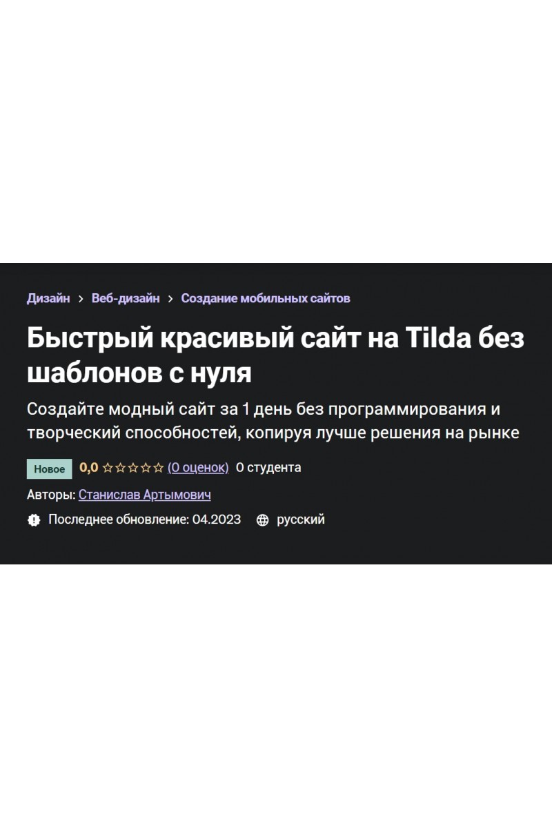 Последнее обновление: 04.2023Быстрый красивый сайт на Tilda без шаблонов с нуляСоздайте модный сайт за 1 день без программирования и творческий способностей, копируя лучше решения на рынкеЧему вы научитесьСозданий модного легдинга за 4-7 часовСоздавать сайты для бизнесов, курсов, экспертов и мероприятийНаходить красивые материалы бесплатно (изображения, значки, иконки)Освоим принципы конверсионных лендингов. Как сделать сайт эффективным.Сборка сайта без программирования и творческих способностейНаходить крутые примеры для вдохновенияТребованияНикаких навыков, кроме как работы с мышкой и браузером не требуется. Всему научитесь с полного нуля.ОписаниеКакой результат курса:Научитесь создавать модные сайты за 1 день без использования шаблонов.Для чего нужны такие сайты:Для услуг, бизнесовДля мероприятийДля интернет-магазиновДля теста гипотез и идейСоздавайте сайты на тильде бесплатно.Почему Tilda?удобный конструкторбез навыков программированияпонятный интерфейсвы можете добавлять собственные блоки с уникальным дизайномогромный выбор шрифтовв Tilda есть инструменты для SEO оптимизациисозданные в этом конструкторе сайты всегда быстро загружаютсяПройдите курс по созданию сайтов на тильде и создавайте что угодно: от лендингов и блогов до интернет-магазинов!