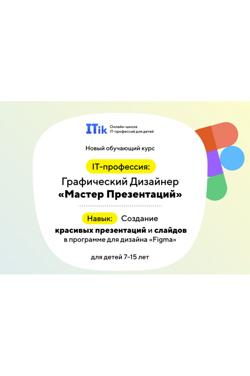 Для детей 7-15 летВаш ребенок научится делать красивые слайды и презентации.Даже если считает, что «не умеет рисовать» и никогда не пользовался программами по графическому дизайну.Курс максимально практический:Свои первые слайды и презентации вашребенок сделает уже на первом урокеДаже если до этого никогда не пользовалсяпрограммами для дизайна и «не умеет рисовать»Результаты вашего ребенка после обучения:Научится создавать красивые слайды для презентацийНаучится создавать профессиональные презентации на любую тематикуНаучится профессионально работать в программе для графического и веб-дизайна «Figma»Будет уметь делать презентации для учебы, проектов, конференций, выступленийПовысится уверенность в себе и успеваемость в школеПочему навык цифрового дизайна нужен КАЖДОМУ ребенкуСамостоятельность это планирование + ответственность.Ребенок научится работать над проектом “от идеи до реализации”. И будет понимать, что результат будет зависеть только от него.Поэтому во время обучения он прокачает планирование, ответственность, а значит и самостоятельность.Творческое мышление и воображениеКаждый проект это придумывание чего-то нового.Каждый раз его можно выполнить по-другому.Практика и опыт применения творческого мышления позволят в дальнейшем находить нестандартные решения различных задач.Даже не связанных с дизайном.Внимание и концентрацияРабота над проектом требует внимания, концентрации и усидчивости. Иначе проект будет завершен с ошибками или вовсе не завершен.Уверенность в себеВаш ребенок научится делать то, что другие делать не умеют. Он будет видеть какой интерес и положительную реакцию вызывают работы, которые он показывает своим друзьям, близким, знакомым.Его будут просить делать дизайны для школы, конкурсов и т. д. Он почувствует свою значимость.Станет более уверенным в себе.Успеваемость в школеНавыки творческого мышления, внимания и концентрации положительно скажутся на изучении любой новой информации. В том числе на уроках в школе.