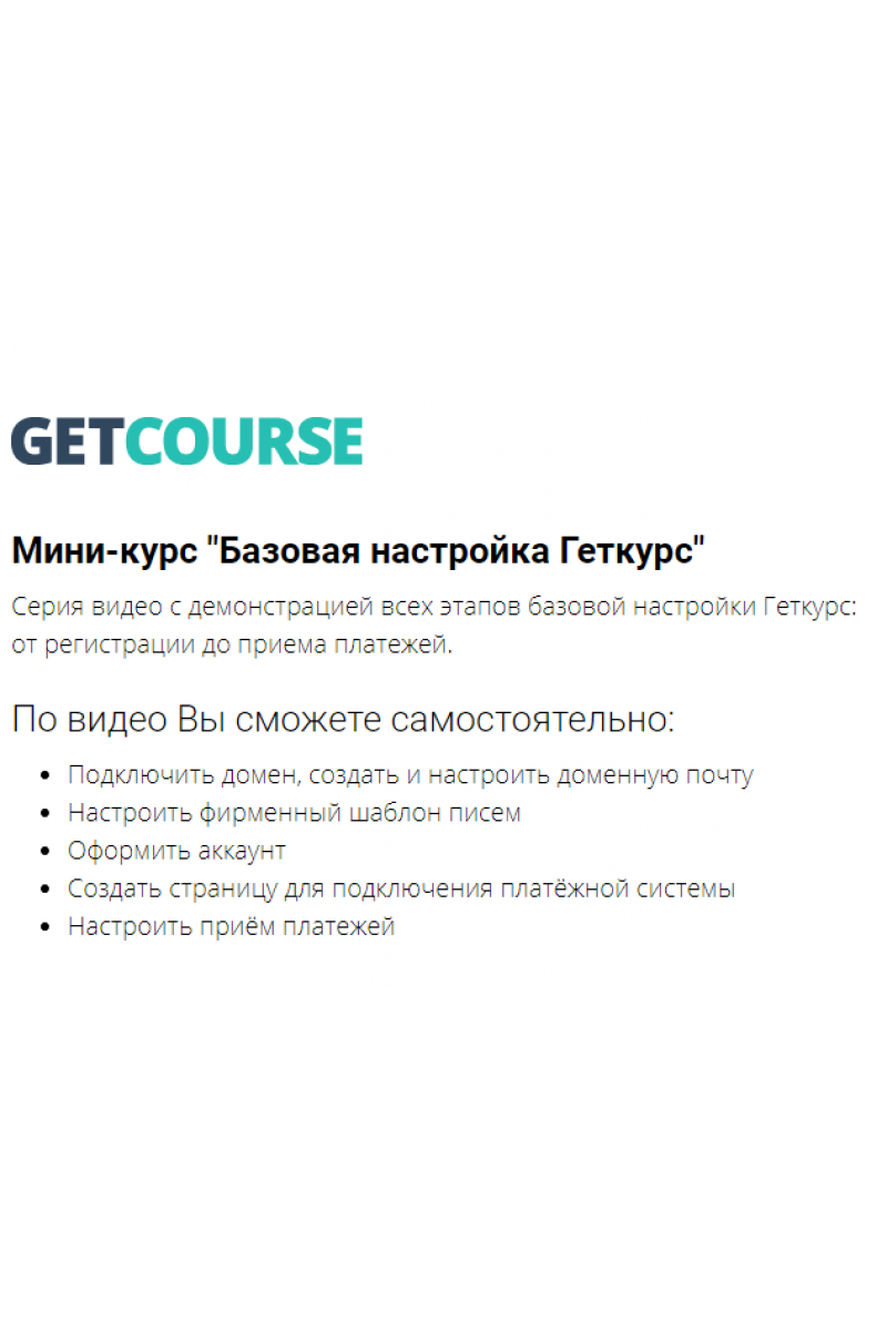 Мини-курс "Базовая настройка Геткурс" Серия видео с демонстрацией всех этапов базовой настройки Геткурс: от регистрации до приема платежей. По видео Вы сможете самостоятельно: