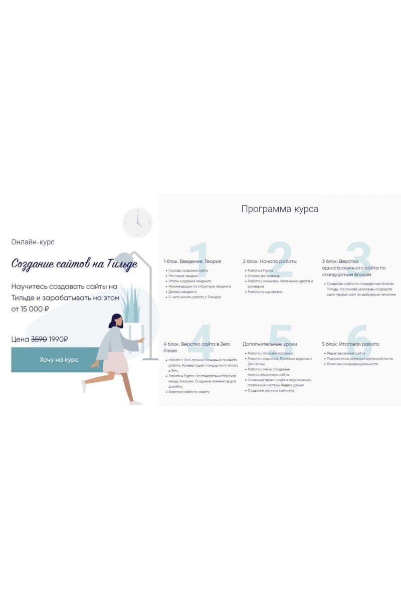 Для кого этот курсДля тех, кто хочет зарабатывать удаленноВы освоите востребованный навык по созданию сайтов, смажете работать и зарабатывать удаленноДля бизнесаВы освоите знания, при помощи которых сможете самостоятельно создать сайт для своего проектаДля фрилансеровХотите дополнить свой багаж знаний новыми востребованными навыками. Услуги по созданию сайтов стоят от 3000 рубПрограмма курса1 блок. Введение. ТеорияОсновы создания сайтаЧто такое лендингЭтапы создания лендингаРекомендации по структуре лендингаДизайн лендингаС чего начать работу с Тильдой2 блок. Начало работыРабота в FigmaСписок фотостоковРабота с иконками. Изменение цветов и размеровРабота со шрифтами3 блок. Верстка одностраничного сайта по стандартным блокамСоздание сайта по стандартным блокам Тильды. На основе уроков вы создадите свой первый сайт по выбранной тематике4 блок. Верстка сайта в Zero блокеРабота с Zero блоком. Основные правила работы. Конвертация стандартного блока в ZeroРабота в Figma. Нестандартный переход между блоками. Создание элементов для дизайнаВерстка сайта по макету5 блок. Итоговая работаРедактирование сайтаПодключение домена и доменной почтыПолитика конфиденциальности