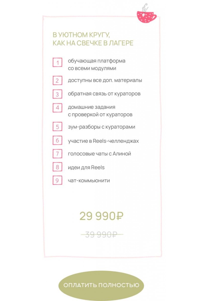 ЧТО ТЕБЯ ЖДЕТ?МОДУЛЬ 1 — ПРЕДОБУЧЕНИЕ⁃ План обучения, как пройти программу максимально эффективно⁃ Как правильно составить цели на обучение, чтобы точно их реализовывать⁃ Как поддерживать себя во время обученияМОДУЛЬ 2 — УПАКОВКА ПРОФИЛЯ⁃ Шапка профиля. Как оставить яркое впечатление при первом касании, чтобы на вас подписывались⁃ Авторская формула-конструктор, как сделать цепляющее описание⁃ Как создать вовлекающие актуальные, список актуальных, которые обязательно должны быть⁃ Базовые правила создания продающего визуалаМОДУЛЬ 3 — ОСНОВЫ ВЕДЕНИЯ STORIES⁃ 3 кита сторис, как формировать план сторис в легкости⁃ Виды сторис — личный, экспертный и жизненный контент. Откуда брать идеи и как гармонично совмещать разные виды контента⁃ Готовые схемы, как совмещать личный, экспертные и жизненные линии⁃ Авторская методика, как легко делать вовлекающий сторителлинг⁃ Как подружиться с аудиторией?⁃ Форматы сторис — как снимать. Как делать разнообразный и интересный контент⁃ Анализ статистики. Как понять на какие сторис лучше всего реагирует аудитория. Как улучшать свой контент на основе анализа⁃ Какие темы поднимают охваты и как ими управлять?⁃ Базовое оформление сторис. Как выбрать шрифты, палитру, элементы и расположить текст⁃ Настройки камерыМОДУЛЬ 4 — ОФОРМЛЕНИЕ STORIES⁃ Как сформировать свой уникальный стиль в сторис — шрифт, цвета, текст⁃ Шрифты (где найти/скачать сторонние шрифты)⁃ Основные плашки/стикеры для текста и оформления⁃ Фильтры для видео⁃ Где я беру музыку для сторис и как ее использую⁃ Авторские правила монтажа и съемки сторис⁃ Как создаются мои сторис, наглядный пример от идеи до загрузкиМОДУЛЬ 5 — ВСЁ ПРО REELS⁃ Алгоритмы reels. Почему одни ролики залетают, а другие нет⁃ Стратегия продвижения. Как выбрать оптимальную стратегию для себя⁃ Виды reels⁃ Где брать идеи для reels⁃ Конструктор идеального рилс. Как создать сценарий для рилс⁃ Структура, как вовлечь человека досмотреть до конца⁃ Создание reels⁃ Монтаж reels⁃ Структура описания в reels. Как делать описание, чтобы его дочитывали до конца⁃ Триггеры заголовков⁃ Как наложить трендовую музыку при размещении reels⁃ Когда и как часто выкладывать reels⁃ Работа с аудиторией в комментариях⁃ Работа с аналитикой. Как определить, какие видео заходят аудитории, а какие нетМОДУЛЬ 6 — ЗАРАБОТОК С REELS⁃ Авторская структура объявления, которая работает⁃ Как делать так, чтобы тебе отвечали⁃ Как создать кейсы⁃ Как взаимодействовать с клиентом, если живем в одном дороге и в разных городах⁃ Как упросить работу⁃ Реквизит, который понадобится⁃ Как установить ценыМОДУЛЬ 7 — СЮРПРИЗ ОТ ПРИГЛАШЕННОГО СПИКЕРАЭто подарок для моих учеников. Уроки будут полезны всем, кто развивает свой блог. Вы узнаете подробности на обученииВ УЮТНОМ КРУГУ, КАК НА СВЕЧКЕ В ЛАГЕРЕ7 модулейдоп. материалыобратная связь от кураторазум-разборы с кураторамидомашние заданияголосовые чатыголосовые чаты с Алинойчат-комьюнити