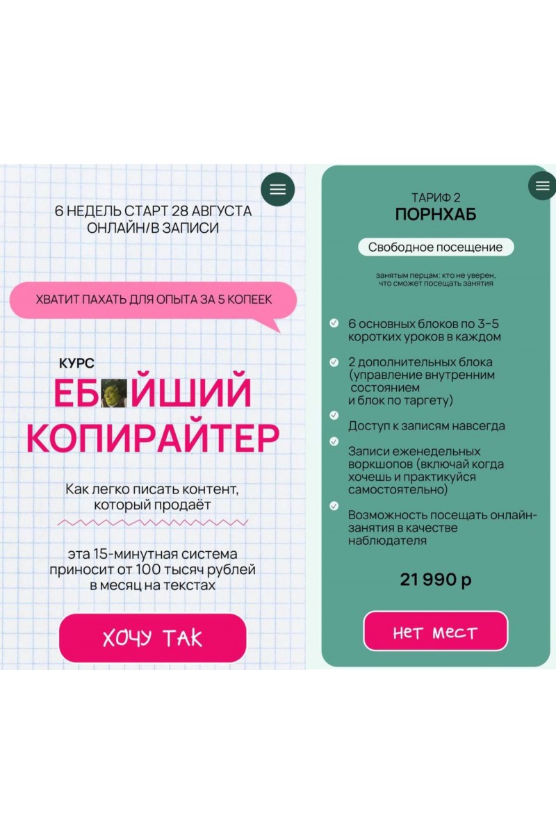 Результат вводной части — Поймёшь, для чего тебе эта прокачка, что ты хочешь от неё получить. Поможет сфокусироваться и не потерять курс в папке «Избранное».Результат 1 недели: Умеешь правильно анализировать целевую аудиторию, изучать тему и знаешь, как писать мощные посты за 15 минут.Результат 2 недели: Умеешь правильно вдохновляться чужими креативами и создавать из них формулы для своих текстов. Можешь составить сильный текст как конструктор из своих наработок.Результат 3 недели: Знаешь, как начать писать, как сгенерить крутую идею из ничего и раскрыть текстом нужные смыслы.Результат 4 недели: Знаешь, как возбудить текстом и бабушку и школьника. Умеешь из рандомного слова придумать и раскрутить идею для своего проекта. Умеешь писать шутки на любую тему.Результат 5 недели: Видишь фишки и ошибки в своих и чужих текстах. Вытягиваешь смыслы из любой строчки. Можешь зацепить ту самую ЦА максимально просто и в кратчайшие сроки.Результат 6 недели: Знаешь, как построить здоровые долгосрочные отношения с текущими клиентами или расстаться с токсичными. Знаешь, как правильно доносить ценность своей работы, чтобы одноразовый клиент переходил в разряд постоянных. Определишь своё ценообразование.Результат блока по состоянию: У тебя появилась энергия. Сил хватает и на работу и на себя и на близких. У тебя повышается самоценность, появляется ощущение ценности себя как специалиста. Ты понимаешь, за что тебе платят. Знаешь, как разграничивать время на работу и ставить для себя удобные дедлайны, перестаёшь брать на себя слишком много. Становишься себе другом, а не карателем.Результат допблока по таргету: Знаешь, как искать чужую рекламу в разных соцсетях и как её использовать для своих задач. Можешь писать тексты для разных площадок (вк, ок, тг). Выучишь язык таргетологов и дизайнеров.Тариф Порнхаб6 основных блоков по 3−5 коротких уроков в каждом2 дополнительных блока (управление внутренним состояниеми блок по таргету)