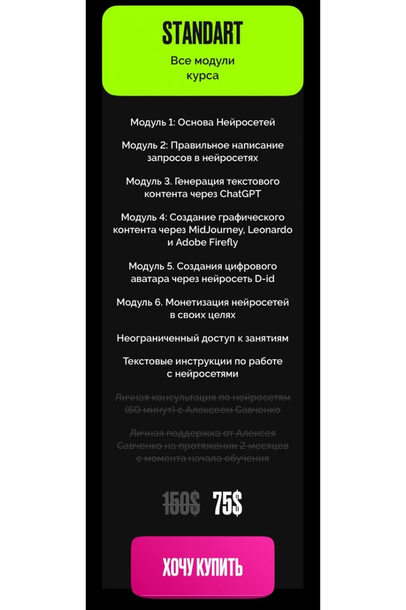Ты освоишь создание контента в 5-ти нейросетях:Chat GPT - Текст и автоматизация работыMidJourney - Изображения и графикаLeonardo - Изображения и графикаAdobe Firefly - Изображения и графикаD-id - Цифровые аватарыПочему нужно начать изучать нейросети прямо сейчас?Избавишься от рутиныСнимешь с себя кучу рутинных задач, которые можно поручить нейросетямАвтоматизируешьСократишь свое рабочее время с помощью автоматизации создания контента в социальных сетях, а также проектах своих клиентовПолучишь время+Получишь дополнительное время на себя, вместо нудных задач, которые выполнят нейросетиНейросети — это не про поиграться сгенерировать картинки в MidJourney или поспрашивать что-то у ChatGPTЭто реальный источник для повышения заработкаДля кого будет полезно это обучение:ФрилансерамВеб-дизайнеры, SMMщики, Маркетологи, ВерстальщикиНаучишься за считанные минуты генерировать текстовый и визуальный контент для себя и проектов клиентовНавсегда забудешь о проблеме создания контента для социальных сетей: научишься автоматически генерировать контент для Постов, Stories, Reels, Tik-Tok, TelegramСоздашь дополнительные источники дохода, за счет внедрения новых услугОсвободишь дополнительное время на себя, перекладывая рутинные задачи на нейросетиБлогерамInstagram, Tik-Tok, YouTube, TelegramНаучишься быстро генерировать контент, а также составлять контент-план на любой срок вперед (даже на месяц)Научишься создавать цифровые аватары, которые заменят тебя в создании контентаРасширишь свою аудиторию на новые страны, за счет создания контента на любых языкахОсвободишь дополнительное время на себя, перекладывая рутинные задачи на нейросетиИнфо-бизнесменамЭксперты, авторы курсов, онлайн-школы, продюсерыНаучишься быстро через нейросети создавать обучающие материалы (pdf чек-листы, лид-магниты и др.)Сможешь переводить и продавать обучение на новые иностранные рынкиОсвободишь дополнительное время на себя, перекладывая рутинные задачи на нейросетиИнтернет-бизнесамПродажа услуг и товаров через социальные сети и маркетплейсыНаучишься быстро создавать контент по теме твоей услуги/товара, вызывающий wow-эффект у целевой аудиторииСоздашь дополнительные источники продаж на новые иностранные рынкиОсвободишь дополнительное время на себя, перекладывая рутинные задачи на нейросетиПрограмма:Модуль 1: Основа НейросетейМодуль 2: Правильное написание запросов в нейросетяхМодуль 4: Создание графического контента через MidJourney, Leonardo и Adobe FireflyМодуль 3. Генерация текстового контента через ChatGPTМодуль 5. Создания цифрового аватара через нейросеть D-idМодуль 6. Монетизация нейросетей в своих целях