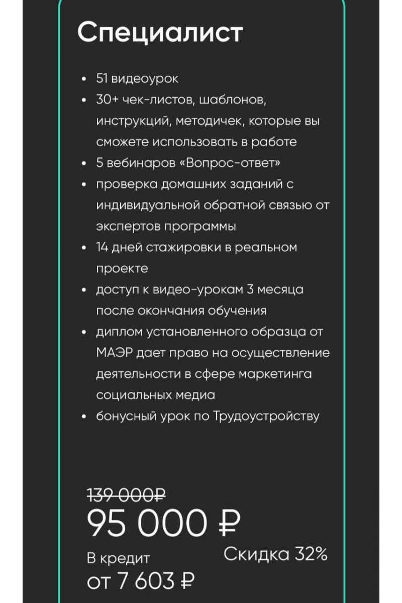 Программа:Модуль 1 Основы профессии: чем на самом деле занимается SMM-специалистМодуль 2 Маркетинговая среда и архитектураМодуль 3 Маркетинг в Яндекс.ДзенеМодуль 4 Маркетинг в TikTokМодуль 5 Маркетинг в VKМодуль 6 Маркетинг в YoutubeМодуль 7 Маркетинг в InstagramМодуль 8 TelegramМодуль 9 TenChatМодуль 10 Дополнительные возможности в работеМодуль 11 Организация работы SMMТариф Специалист51 видеоурок30+ чек-листов, шаблонов, инструкций, методичек, которые вы сможете использовать в работебонусный урок по Трудоустройству