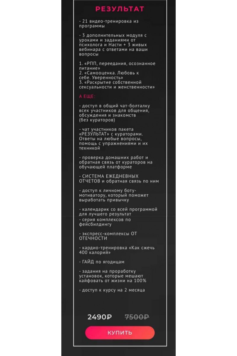 - 21 видео-тренировка из программы- 3 дополнительных модуля с уроками и заданиями от психолога и Насти + 3 живых вебинара с ответами на ваши вопросы1. «РПП, переедания, осознанное питание»2. «Самооценка. Любовь ксебе. Уверенность»3. «Раскрытие собственной сексуальности и женственности»