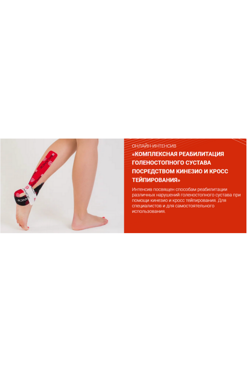 Интенсив посвящен способам реабилитации различных нарушений голеностопного сустава при помощи кинезио и кросс тейпирования. Для специалистов и для самостоятельного использования.Проблема реабилитации различных нарушений голеностопного сустава никогда не потеряет свою актуальность, не смотря на обилие хирургических, ортопедических и физиотерапевтических решений. Во всем мире специалисты ищут максимально эффективные подходы к реабилитации, стараясь снизить инвазивность воздействия. Кинезио и кросстейпирование - идеальный вариант, доказавший свою эффективность и скорость реабилитационных возможностей при минимальном вмешательстве.Принципы кросстейпирования, необходимые для работыПринципы кинезиотейпирования, необходимые для работыСнятие отека голеностопного сустава травматического или хронического характераВарианты стабилизации голеностопного сустава путем ортопедической поддержки связок и сустава в целомКинезиотейпирование при травматических поражениях ахиллова сухожилия и трехглавой мышцы голениКинезиотейпирование при травматических поражениях боковых связок голеностопного сустава и удерживателей сухожилийSwanКросстейпирование при боли в голеностопном суставе (мышечно-связочная стабилизация посредством рецепторной стимуляции)Восстановление функции голеностопного сустава после хирургического лечения (общая реабилитационная схема Кросс + кинезиотейпы)Динамическое тейпирование для восстановления амплитуды движения в голеностопном суставе после вынужденной иммобилизацииСтабилизация таранно-пяточного сочленения и ротация стопы для снижения повторного травматизма с помощью кинезиотейпированияКомплексный подход к реабилитации после перелома лодыжкиДля кого:для врачей разных направлений: неврологи, травматологи, реабилитологи, эрготерапевты, мануальные терапевты, остеопаты, ортопеды и др.для массажистов различных профилей: классический медицинский массаж, восточные направления в реабилитации, специалисты по акупунктуредля спортивных тренеров и инструкторов по йоге, силовому спорту, легкой атлетике, фитнесу и др.для тех, кто интересуется концепцией и методами тейпированиядля всех желающих повысить уровень своих знаний