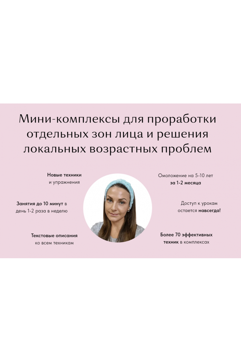 Мини-комплексы для проработки отдельных зон лица и решения локальных возрастных проблемНабор из 5 комплексов «Проработка всех зон лица»На лоб и межбровкуНа зону глаз На носогубную зонуПодтяжка брылей и овала лицаПодтяжка подбородка и шеиКому подойдут мини-комплексы:Тем, кто хочет проработать точечно возрастные изменения в локальных зонахТем, кто обучается на моих программах, но хочет более выраженный результат омоложенияТем, кто хочет заниматься омоложением лица с минимальными вложениямиТем, у кого нет времени на проработку всего лица