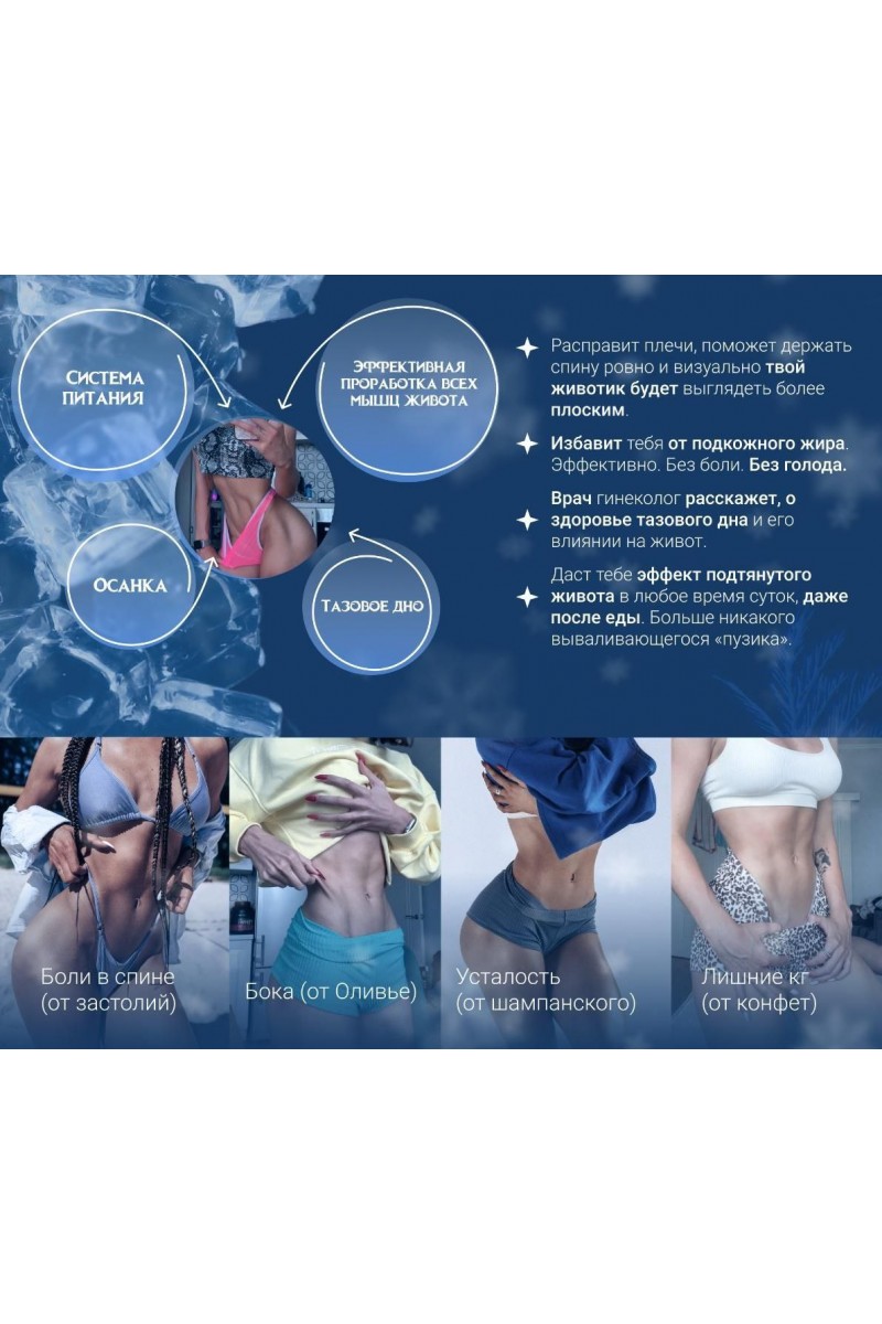21 день ежедневных утренних тренировок и теоретической частиЕжедневные тренировки в формате "включай и повторяй"Проработка глубоких мышц животаПроработка всего кораКомплексы на улучшение осанкиНалаживание питанияНовые пищевые привычкиТехники мотивации от психолога