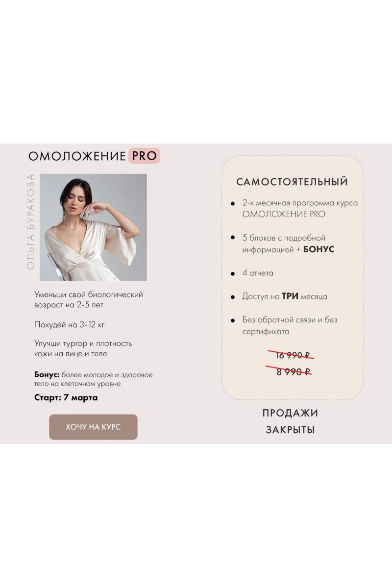 Уменьши свой биологический возраст на 2-5 летПохудей на 3-12 кгУлучши тургор и плотность кожи на лице и телеБонус: более молодое и здоровое тело на клеточном уровнеЭТОТ КУРС ДЛЯ ТЕБЯ, ЕСЛИ:Ты видишь первые признаки старения: морщинки, снижение тургора кожи на лице/теле, отечность, брыли, хронологический возраст не важенТы чувствуешь снижение объема и тонуса мышц: провисшая попа, трицепс, дряблый живот и тдТы хочешь продлить молодость на клеточном уровнеТы пробовала ботокс, филеры, липолитики и прочее, но осталась недовольна результатомТы “паришься" на счет того, что тебе скоро 30, 40, 50 летТы хочешь узнать секреты составления рациона именно для омоложенияТы не можешь решить проблему с целлюлитомТы страдаешь от отечности лица или телаТы чувствуешь себя менее привлекательной, чем 5-10-15 лет назадТы хочешь помолодеть минимум на 2-5 лет всего за 2 месяца!ТВОЙ РЕЗУЛЬТАТ ВСЕГО ЗА 2 МЕСЯЦА:Похудение на 3-12 кгСнижение отечности лица, лифтинг лицаСнижение биологического возраста на 2-5 летУлучшение метаболизма и более корректная работа организма на клеточном уровнеУвеличение количества и улучшение качества митохондрийУлучшение качества кожи и ее уплотнениеУменьшение целлюлита и проблемных зонУстранение многих дефицитов витаминов и минераловУкрепление мышц и улучшение выносливостиСнижение уровня скрытого воспаленияЛЕКЦИИ, КОТОРЫЕ ТЕБЯ ЖДУТ:БЛОК 1 Что мы будем делать?Самое эффективное питание для омоложенияФайлы с меню и правилами питания на первые 10 днейОсновы антивозрастного ухода за лицомЛимфодренажный массаж лицаЛимфодренажные и укрепляющие упражненияОчищение и лимфодренажAnti age уход за телом с кремами и эфирными масламиАнтивозрастной спорт на курсеРежим дня для омоложенияБЛОК 2 Про питаниеДиета для продления молодостиПродукты, которые приводят к ускоренному старениюБЖУ и схема anti age питанияМетионин, ИИ, ГИ, AGE и старениеБЛОК 3 Anti AgeЛимфодренажОмолаживающий спорт и митохондрииСтресс и старениеAnti stress программаЕстественное увеличение гормона ростаПсихология anti age. Как перестать бояться возраста?Диагностика старения по анализамБЛОК 4 Про коллагенЧто такое коллаген?ГликостарениеСхема БАД для улучшения качества кожиБЛОК 5 Гены и дополнительные знания про старениеБиологический (метаболический) и хронологический возрастГены старения: как остановить?Гены омоложения: как запустить их работу?Митохондрии, рак и мутации клетокСхема омоложения клетокЗдоровье печени и старениеAnti age схема с эфирными маслами – в подарок!БЛОК 6 БОНУСДефициты витаминов и минералов, разрушающие женское здоровьеСхема восполнения дефицитовСхема для ускорения жиросжигания (проблемные зоны и плато)
