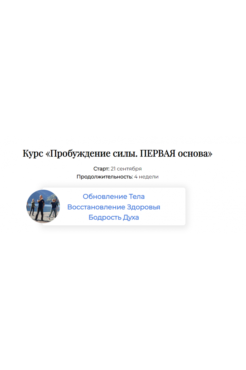 Идут еженедельные открытые вебинары, на которых раскрывается тема. Затрагиваются темы дыхания, звуков.САМОСТОЯТЕЛЬНЫЙ12 видео уроковСамостоятельная практика по видео-урокамДыхание = ЖизньКак остановить разрушение телаКак быстро восстановить энергиюКак очистить хронические напряжения и болезниКак пробудить духовные силы и добродетелиКак Пробудить ДушуВ рамках данного курса я хочу передать вам основу моей методики, эффективность которой помогла множеству моих студентов восстановить здоровье и радость жизни.Первая Основа является базовой и неотъемлемой практикой в рамках моего уникального комплекса "8 Основ Обретения Жизненной Силы".Мы пройдем Первую Основу на четырех уровнях:Базовом, Среднем, Высшем и Тайном.— Кому подойдёт наша пошаговая программаДля кого курсЛюдей, страдающих от хронической усталости и бессонницы, и желающие повысить свой уровень энергииТех, кто ищет решение для хронических заболеваний и желает восстановить свое здоровье без использования сильных лекарствЛюдей, стремящихся к долгосрочному улучшению своего физического и эмоционального благополучияТех, кто хочет научиться эффективным и практичным методам управления стрессом и общего самочувствияЛюдей, интересующихся гармонией между телом и разумом, и желающих обрести баланс в своей жизниЛюдей, уже давно занимающихся самооздоровлением и заботой о себе, чувствующих, что достигли многого, но хотели бы добавить новые инструменты для работы с телом, духом и энергией