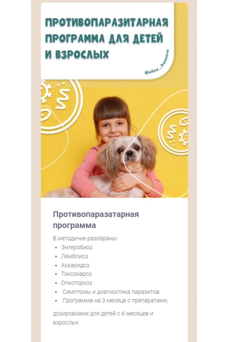 В методичке разобраны:ЭнтеробиозЛямблиозАскаридозТоксокарозОписторхозСимптомы и диагностика паразитовПрограмма на 3 месяца с препаратами,дозировками для детей с 6 месяцев и взрослых