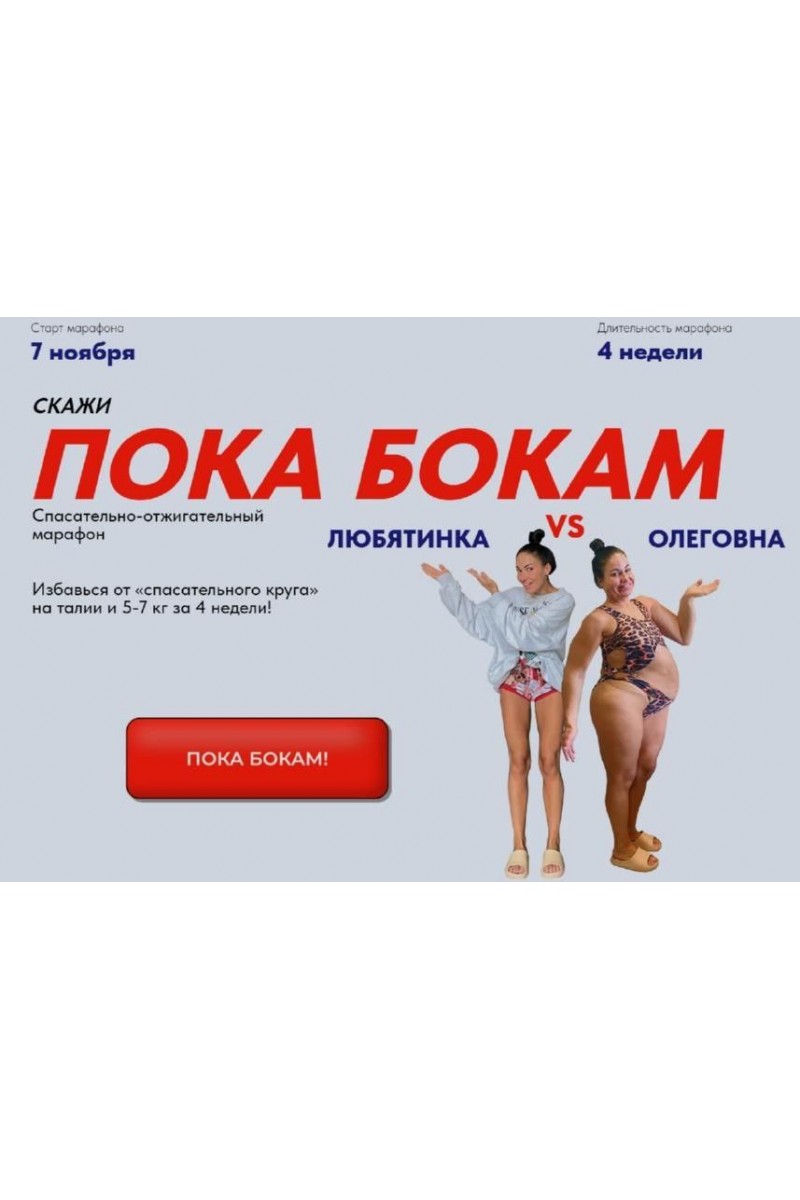 Если у тебя до сих пор не получилось накачать пресс смехом, а аффирмации в стиле “жир с пуза свали к любовнице в рейтузы” не дали эффект, я жду тебя в моем спасательно-отжигательном марафоне!Всего месяц правильного питания и классных тренировок подарят тебе не просто красивое тело, но и энергию, уверенность в себе, ощущение собственной офигенности, новых друзей и классный опыт работы над собой в кайф!ЧТО ВНУТРИ?20 тренировок в записи12 тренировок с постепенным увеличением нагрузки в режиме реального времени с паузами, чтобы передохнуть (ударение на У)* сложное доп. оборудование не требуется! Да, 2 бутылки сухого подойдут в качестве гантельНовинка! Еще 8 прожаривающих 10 -15 минутных тренировок на проблемные зоны:3 тренировки на ягодицы как у светской львицы3 тренировки на пресс шоб был как у принцесс2 тренировки на жиротоп для красивых тел и попРецепты готовые, вкусные и быстрыеА также:Список замен, чтобы у вас не болела голова чем заменить какой-то продуктГотовая продуктовая корзина (список продуктов для покупки конкретного рациона)Новинка! Дневник покабокальщицы поможет не сбиться с фитнес пути истинного и фиксировать достижения!3 рациона 3-х разового питаниябез ограничений – для диких львицвегетарианское – для грациозных ланейбез молочки (лактозы) и глютена – для четких телочек* кормящим львицам-тигрицам можно!Новинка! Вкуснятинка от Любятинки10 рецептов десертов, чтоб росла не джопа, а настроение10 рецептов осенних напитков – без градуса, но согревающих тело и душу лучше пледа
