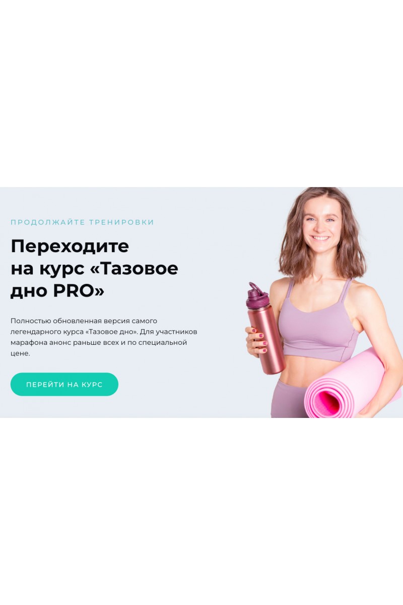 Тазовое дно PROПолностью обновленная версия самого легендарного курса«Тазовое дно».Программа курсаНОВЫЕ ТРЕНИРОВКИ И ПЕРИОДИЗАЦИЯ НАГРУЗКИ+1414 новых тренировок для мышц тазового днаНа марафоне вы попробовали 10 комплексов, в курс входит 24 основные тренировкидля тазового дна от 30 до 45 минут.+1616 новых комплексов для всего телаВ курсе вас ждут 16 оздоровительных мини-тренировок до 15 минут для шеи, стоп, ягодиц, грудного отдела, от шрамов, для тазобедренных суставов и гортани.8 Модулей
