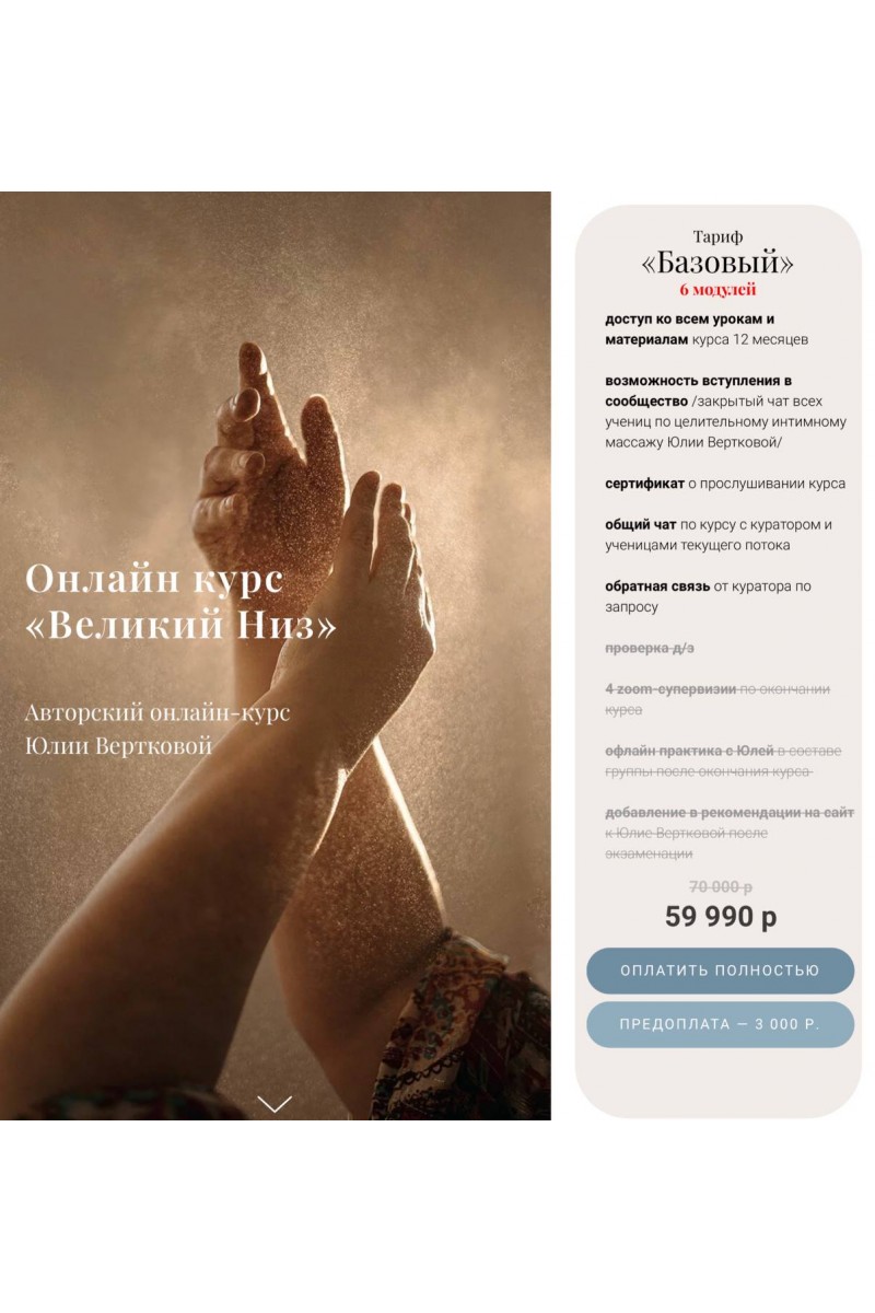Этот курс подойдёт:каждой Женщине любого возраста, которая готова углубить связь со своим Внутренним пространством великого низа, Душой и Эмоциональным «я»женщинам, у которых есть проявление болезненных менструаций, эндометриоза, боли и нечувствительности при близости, вагинизма, опущения органов /чувство тяжести в малом тазу/, недержании мочиженщинам, испытывающим сложности с зачатиемженщинам, исцеляющим свой Низ после потерьженщинам, восстанавливающимся после сексуальных травмвзрослым девственницампредставителям любой поддерживающей профессии /массажист, доула, психолог, остеопат, акушерка и тд.мастерам, проводящим Женские Кругимастерам, проводящим Женские Баниженщинам, исследующим телесные практики и практики работы с Душойженщинам, чувствующим Зов, которым Юлия Верткова отзывается, как мастерПрограмма курса:1 модуль «Матка. Правда»1. Матка, из которой я родилась2. Первозданная и природная женщина3. Мужчины, которых мы любим. Прощение4. Женщины, которых мы любим. Прощение5. Женщина — Река6. Женский Путь — путь любви7. Диалог и тишина8. Признание утраченного9. Возвращение радости в женский центр2 модуль «Взаимодействие с Человеком»1. Голоса женщин2. Взросление женщины /юность и зрелость/3. Соединение с собой — самость4. Женщина — пустыня или океан. Наполненность женщины5. Целая, видимая женщина6. Душа женщины. Знающая женщина7. Мягкость и жесткость8. Обиженная сексуальность9. Сила любить себя, Сила любить другого3 модуль «Здоровье матки. Процессы, трансформирующие "Великий Низ"»1. Ритмы и цикл женщины2. Девственность3. Живот — жизнь, чрево и лоно4. Оргазмичность5. Роды как трансформация6. Вагина — что копит в себе?/молочница, цистит, эрозия, киста, миома, эндометрит/7. Раненая матка/потери, операции, аборты, сексуальное насилие /8. Отсутствие матки, яичников, труб9. Климакс. Взрослое влагалище4 модуль «Прикосновения к себе. Возвращение тепла»1. Забота о себе и о своей интимности2. Прикосновения к себе и самомассаж3. Прогревание влагалища4. Забота о себе в бане5. Женские травы. Тепло трав6. Компресс касторовым маслом7. Промасливание влагалища перед родами5 модуль «Взаимодействие с интимными мышцами»1. Тазовое дно и мышечные слои — как опора.Практика дыхания2. Трудности: Слабость мышц. Недержание мочи. Дефекация.Бонус — «Практика Укрепление мышц тазового дна»3. Золото голоса/отсыл к связкам голосовым и тазового дна/Бонус — практика с Ириной Кромм/профессиональной вокалисткой/4. Сухость. Улучшение кровообращения.Бонус — Практика5. Либидо. Бонус — «Практика признания Великого Низа для возвращения контакта со своей маткой для эмоционального исцеления»6. Скованное влагалище. Вагинизм. Бонус — Практик6 модуль «Секс»1. Радость в Сексе2. Половой акт или близость3. Секс как манипуляция4. Секс как продолжение диалога5. Секс и ДушаПрактики модуля:«Чувственный массаж мужского члена»«Чувственный массаж женского лона»7 модуль «Целительный интимный массаж. Теория»1. Мастер. Понимание Мастера, мастерства, передавание практики2. Этика при взаимодействии с интимностью3. Показания к массажу4. Противопоказания к массажу. Физические и психические5. Безопасное место. Организация пространства. Масла для взаимодействия6. Разговор перед массажем7. Таз. Подвижность. Расслабление8. Женская репродуктивная система9. Тазовое дно и мышечные слои10. Связки матки11.