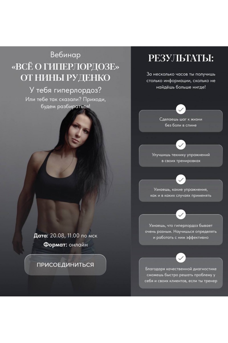 У тебя гиперлордоз? Или тебе так сказали?Приходи, будем разбираться!Вебинар для тебя, если:Болит спина после тренировок, прогулок или даже стоя.Не получается создать попу мечтыДелаешь упражнения с прогибом в поясницеТы тренер и хочешь круто разобраться в этой теме, чтобы быстро и эффективно решать проблему у своих клиентов.Результаты:За несколько часов ты получишь столько информации, сколько не найдёшь больше нигде!- Сделаешь шаг к жизни без боли в спине.- Улучшишь технику упражнений в своих тренировках- Узнаешь, какие упражнения, как и в каких случаях применять- Узнаешь, что гиперлордоз бывает очень разным. Научишься определять и работать с ним эффективно- Благодаря качественной диагностике сможешь быстро решать проблему у себя и своих клиентов, если ты тренер.