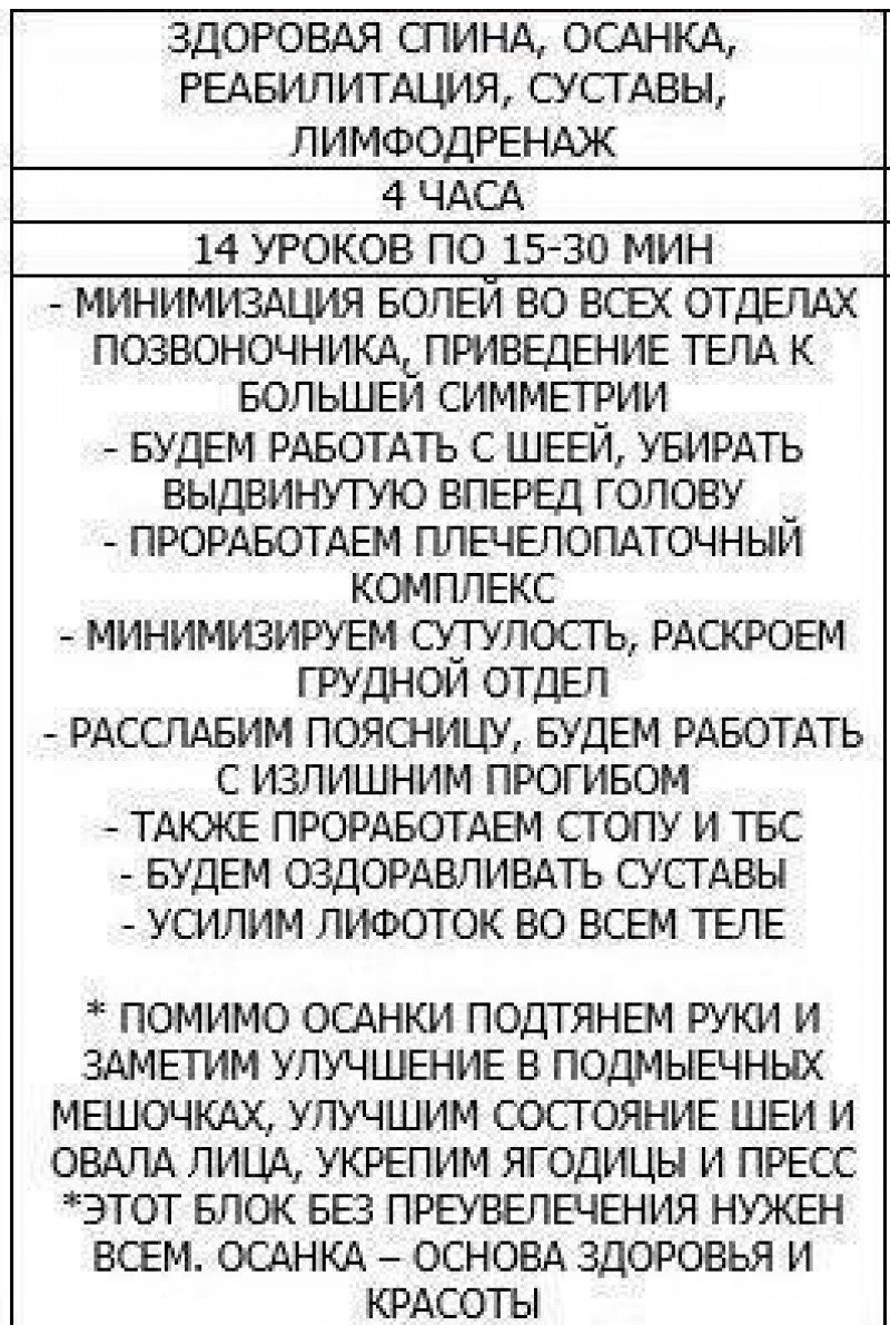4 часа14 уроков 15-30 мин1. Минимализация болей во всех отделах позвоночника, приведение тела к большей симметрии2. Будем работать с шее, убирать выдвинутую вперед голову3. Проработаем плечелопатный комплекс4. Минимализируем сутулость, раскроем грудной отдел5. Расслабим поясницу, будем работать с излишним прогибом6. Также проработаем стопу и ТБС7. Будем оздоравливать суставы8. Усилим лимфоток во всем теле9. Помимо осанки подтянем руки и заметим улучшение в подмышечных мешочках, улучшим состояние шеи и овала лица, укрепим ягодицы и пресс*ЭТОТ БЛОК БЕЗ ПРЕУВЕЛЕЧЕНИЯ НУЖЕН ВСЕМ. ОСАНКА — ОСНОВА ЗДОРОВЬЯ И КРАСОТЫ