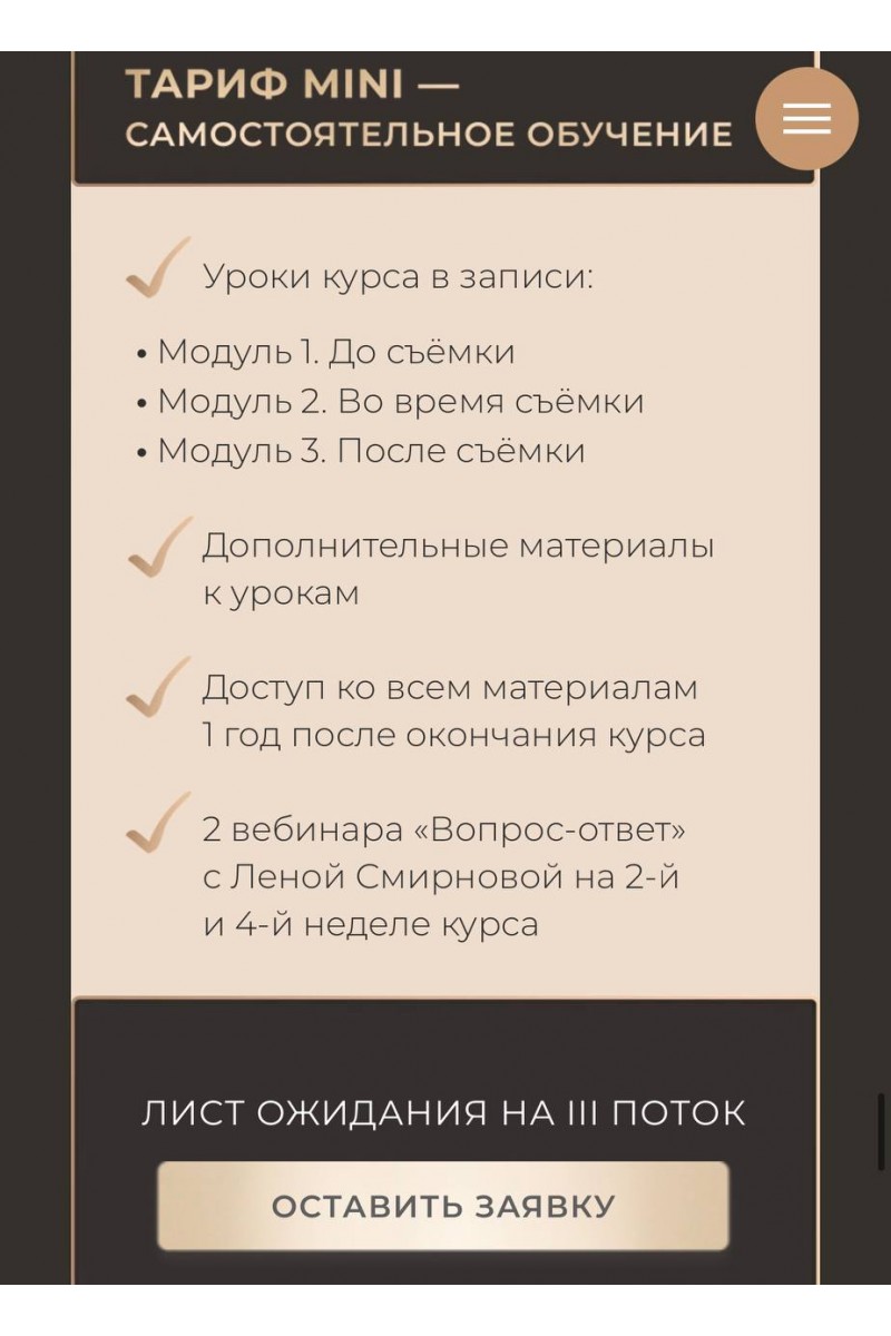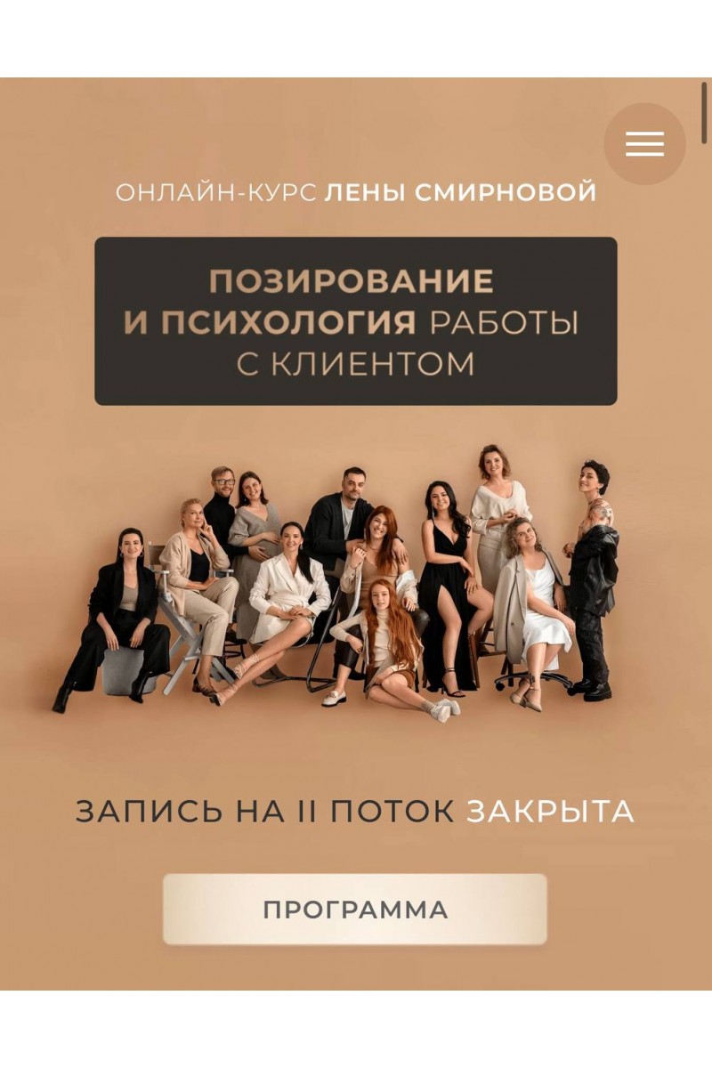 Вы получите: запись онлайн курсаГлавное для фотографа - это умение раскрепощать людей и видеть в них прекрасное, а именно:подбирать правильный ракурс и задавать то положение тела, в котором человек будет смотреться органично и естественносоздавать такую атмосферу на площадке, в которой будет легко раскрыться самому зажатому героюнаправлять, помогать, а порой и создавать такие сюжеты и ситуации, в которых с помощью выгодного позирования удастся показать лучшее в человекенаходить такие слова, которые растопят лёд между вами и героем, вызовут улыбку и зажгут в глазах огонёк!О чем:Раскрепощение. Не знаешь, как раскрепостить клиента, не получается добиться живых эмоций и естественных поз?Общий язык. Не знаешь, о чём говорить до съёмки, во время и после, сложно находишь общий язык с героями?Клиенты. Испытываешь стресс при работе с определёнными клиентами - plus-size девушками, взрослыми женщинами, мужчинами, которые не расположены к съемке?Позы и ракурсы. Сложно придумываешь новые позы и ракурсы, подходящие конкретному человеку? Не знаешь, как расположить руки, ноги, поставить корпус?Возражения. Теряешься при работе с возражениями, не можешь донести свою позицию и, как следствие, не получаешь нужный результат?Результат. Нет ощущения контроля и управления эмоциями и атмосферой на площадке, каждая коммерческая фотосессия - лотерея с непредсказуемым результатом?