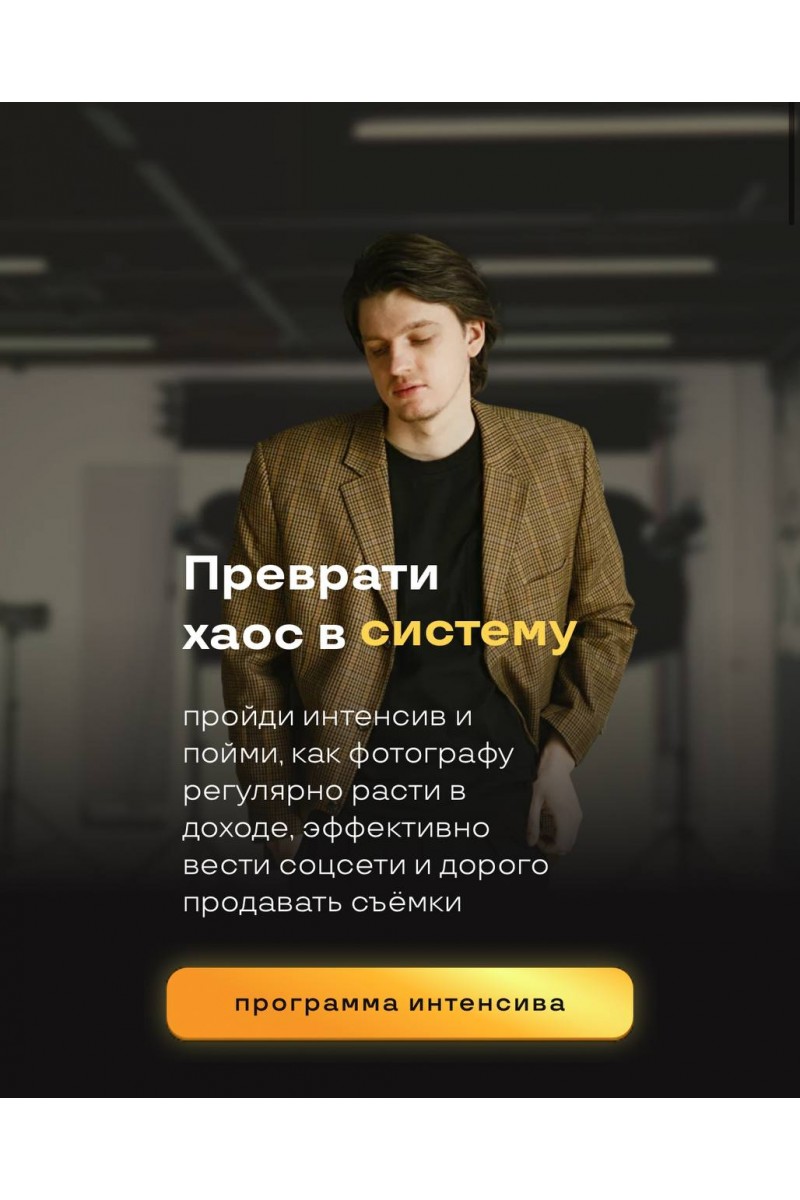 ПрограммаКак эффективно находить и договариваться с моделями и блогерами на фотосъёмкиКак правильно и массово продавать свои услуги фотографаКак организовать идеальную фотосъёмку? Композиция, цвет и свет в фотографии при работе с модельюОбработкаКак создать себе репутацию и стать популярным в своём городе?Как эффективно продвигаться и привлекать новых клиентов через инстаграм и ВКонтакте?Как сформировать собственный стиль?Установки и убеждения, которые не дают вам расти