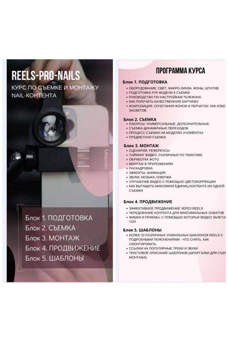 БлОК 1. ПОДГОТОВКАОБОРУДОВАНИЕ: СВЕТ, МАКРО-ЛИНЗА, ФОНЫ, ШТАТИВПОДГОТОВКА РУК МОДЕЛИ К СЪЕМКЕРУКОВОДСТВО ПО НАСТРОЙКАМ ТЕЛЕФОНАКАК ПОЛУЧИТЬ КАЧЕСТВЕННУЮ КАРТИНКУКОМПОЗИЦИЯ. СОЧЕТАНИЯ ФОНОВ И ПЕРЧАТОК: КАК ИЗБЕЖАТЬ ЗАСВЕТОВКАК ПОДГОТОВИТЬ ГАЛЕРЕЮ ТЕЛЕФОНА ДЛЯ УДОБСТВА МОНТАЖАБлок 2. СЪЕМКАРАКУРСЫ: УНИВЕРСАЛЬНЫЕ, ДОПОЛНИТЕЛЬНЫЕСЪЕМКА ДИНАМИЧНЫХ ПЕРЕХОДОВПРОЦЕСС СЪЕМКИ НА МОДЕЛЯХ И КЛИЕНТАХПРЕДМЕТНАЯ СЪЕМКАФОКУС С МАКРО-ЛИНЗОЙШОК-КАДРЫБлок 3. МОНТАЖСЦЕНАРИЙ, РЕФЕРЕНСЫТАЙМИНГ ВИДЕО, РАЗЛИЧНЫХ ПО ТЕМАТИКЕОБРАБОТКА ФОТОМОНТАЖ В ПРИЛОЖЕНИЯХРАСКАДРОВКАЭФФЕКТЫ, АНИМАЦИЯЗВУКИ, МУЗЫКА, ОЗВУЧКАУЛУЧШЕНИЕ ВИДЕО С ПОМОЩЬЮ ЦВЕТОКОРРЕКЦИИКАК НАЛИТЬ ГЕЛЬ ИЗ ТЕЛЕФОНА, ЭФФЕКТ РЕНТГЕНА, КАК ДОСТАТЬ ПРЕДМЕТЫ ИЗ ТЕЛЕФОНАБлок 4. ШАБЛОНЫ20 РАЗЛИЧНЫХ УНИКАЛЬНЫХ ШАБЛОНОВ REELS С ПОДРОБНЫМИ ПОЯСНЕНИЯМИ - ЧТО СНЯТЬ, КАК СМОНТИРОВАТЬССЫЛКИ НА ПОПУЛЯРНЫЕ ТРЕКИ И ЗВУКИТЕКСТОВОЕ ОПИСАНИЕ ШАБЛОНОВ (ШПАРГАЛКИ ДЛЯ СЪЕМОК И МОНТАЖА)ЭКСПРЕСС МОНТАЖ, ПЕРЕХОДЫ ДО-ПОСЛЕБлок 5. ПРОДВИЖЕНИЕЭФФЕКТИВНОЕ ПРОДВИЖЕНИЕ ЧЕРЕЗ REELSЧЕРЕДОВАНИЕ КОНТЕНТА ДЛЯ МАКСИМАЛЬНЫХ ОХВАТОВФИШКИ И ПРИЕМЫ, С ПОМОЩЬЮ КОТОРЫХ ВИДЕО ЗАЛЕТАЮТ В ТОПКАК ВЫТАЩИТЬ МАКСИМУМ ЕДИНИЦ КОНТЕНТА ИЗ ОДНОЙ СЪЕМКИОБЛОЖКИ, ОПИСАНИЕ