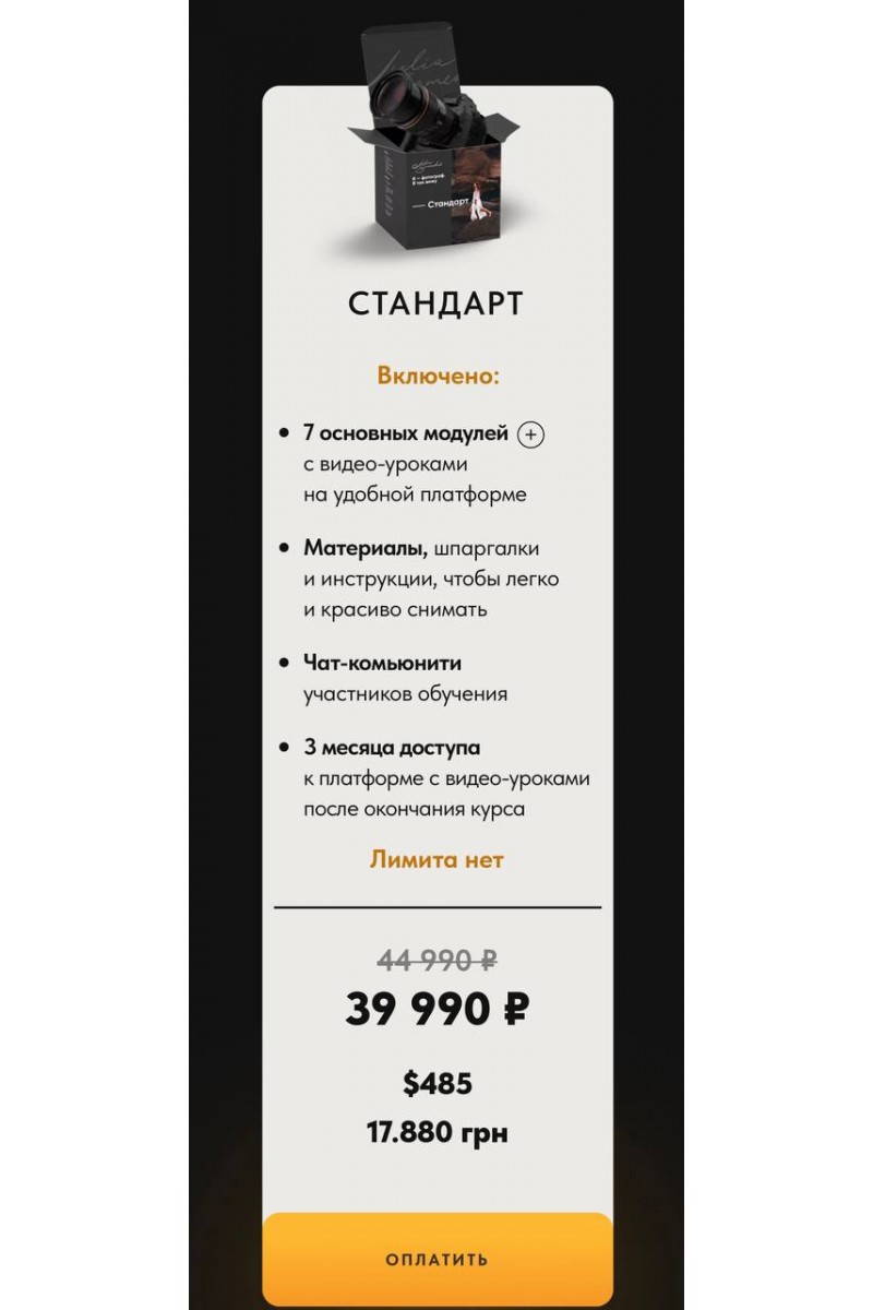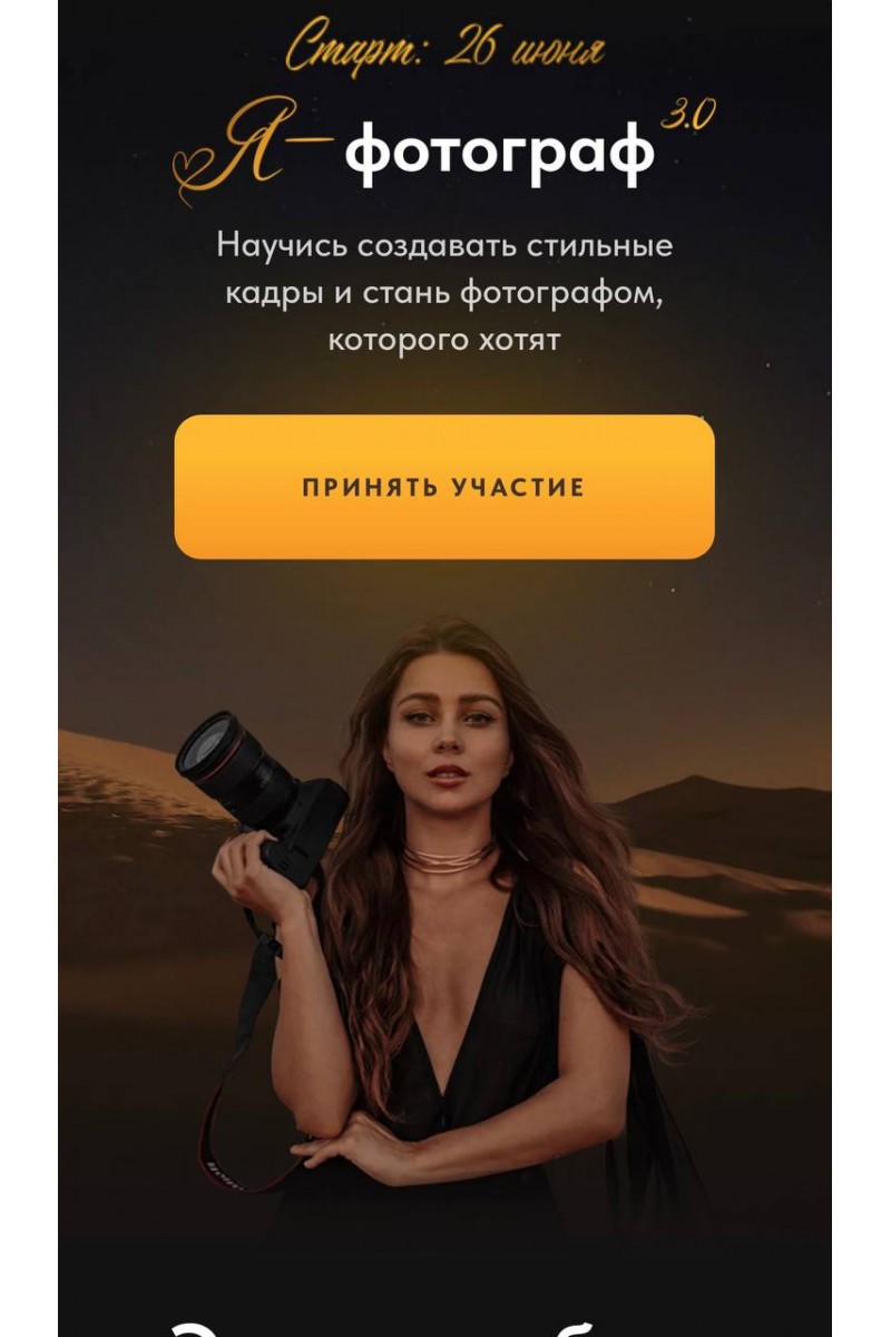 Модуль 1.Как стать фотографом с нуля?Содержание:Введение в профессию фотографаКак выбрать свою нишу в фотографии?28 шагов, чтобы стать востребованным фотографомГлавные страхи фотографа и как с ними работатьПостановка целей и стратегия действийМатериалы:Гайд по выбору нишиЧек-лист «28 шагов к тому, чтобы стать востребованным фотографом»Модуль 2.Техника и ПОСодержание:Выбор камеры и объектива для работыНастройки камеры: за что отвечает каждый параметр и когда они нужныГде и как хранить фотографии?Программы для обработкиМатериалы:Гайд «Как ухаживать за техникой»Гайд «8 вещей, которые нужно сделать после покупки камеры»Модуль 3.Свет, цвет и композицияСодержание:Свет, тень, объёмТипы света и как они работаютЦвет и цветовой кругПсихология цвета: как создать нужное настроение с помощью цветаЦветовые сочетания, которые использую яКомпозицияМатериалы:Гайд «Композиционные приёмы»Шпаргалка по характеристикам цветаШпаргалка по цветовым схемамГайд «Цветовой круг»Модуль 4.Подготовка к съёмкеСодержание:Этапы подготовки к съёмкеСоставление мудборда и поиск референсовПодбор локации и времени суток для съёмкиОбраз модели: одежда, аксессуары, макияж и укладкаВыбор техники для разных съёмокМатериалы:Мои мудборды для съёмокМудборы образов моделей для съёмокПримеры локаций для съёмокЧек-лист подготовки к съёмке для фотографаЧек-лист подготовки к съёмке для моделиМодуль 5.СъёмкаСодержание:Правила комфортной съёмкиРабота с клиентами: с кем лучше не проводить съёмки?Приёмы для идеальной живой, глубокой и разнообразной съёмкиКак сохранить пропорции модели и расслабленность в кадрахСъёмки outside и в студииМатериалы:Гайд «8 правил комфортной съёмки»Чек-лист «20 приёмов для живой, глубокой и разнообразной съёмки»Модуль 6.Обработка в LightroomСодержание:Знакомство с Lightroom: основные функции и рабочие панелиРабота с пресетами: как подбирать и редактировать пресетыЕдиный стиль в обработкеСоздание своих пресетовПрактика: цветокоррекция в разных условиях освещенияМатериалы:Скринкасты по обработке кадров с 7 съёмок в разных условияхМодуль 7.Обработка в Adobe PhotoshopСодержание:Знакомство с Adobe Photoshop: основные функции и рабочие панелиРетушь мужских / женских портретов в PhotoshopМатериалы:Гайд «Горячие клавиши Adobe Photoshop»Скринкасты по ретуши разноплановых кадровБанк лайфхаков в Photoshop