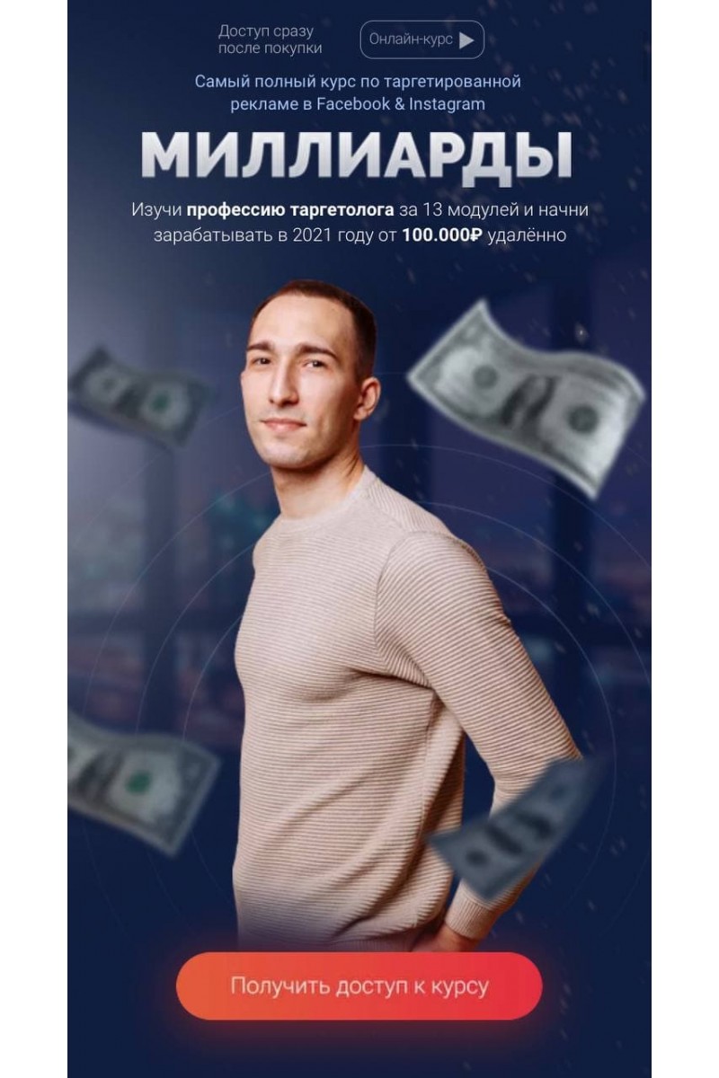 КОМУ ПОДОЙДЕТ ЭТОТ КУРС?Новичкам в таргетеТем, кто хочет полноценно изучить профессию и заработать удаленно свои первые деньги. Понять, что это реально, и продолжить развиваться в направлении таргета.Таргетологам с опытомТем, кто уже попробовал себя в сфере таргета, но понимает, что есть еще очень много информации, которую нужно изучить. Кому нужна практика и крутое окружение.Фрилансерам, застрявшим на своем доходеSMM-специалистам и другим фрилансерам, которые работают с таргетированной рекламой пока только на базовом уровне.Предпринимателям для роста в бизнесеТем, у кого уже есть бизнес и не хватает знаний о механике таргетированной рекламы изнутри. А также тем, кто хочет отправить своего сотрудника на курс для повышения квалификации.КАК ИМЕННО ТЫ БУДЕШЬ ЗАРАБАТЫВАТЬ?1 Изучишь таргетированную рекламу от А до Я на курсе2 Найдешь первого клиента уже во время обучения и будешь практиковаться на реальном проекте3 Составишь портфолио и начнешь искать платных клиентов
