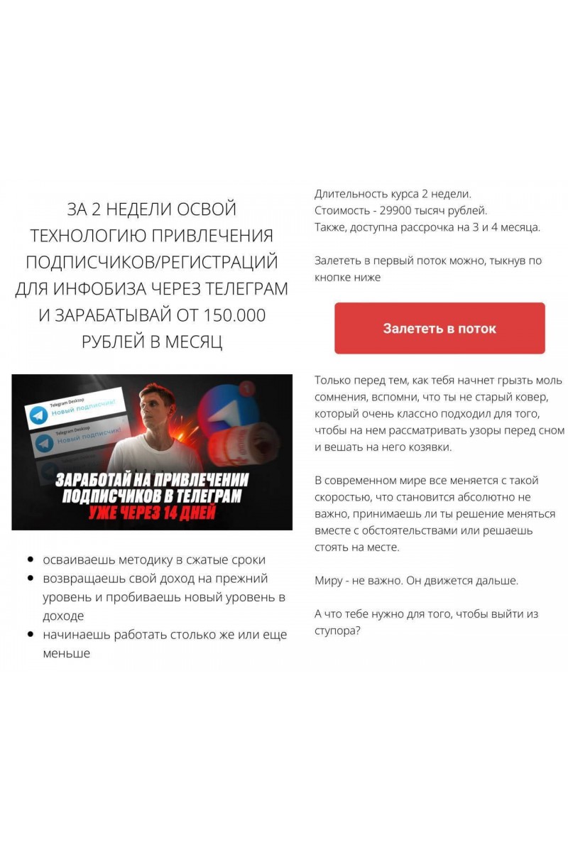 Давай еще раз разберем, что тебя ждет на курсе:Быстрые первые деньги. Чтобы тебе не получилось перегореть отдолгих результатов, мы будем получать результаты быстро. Быстро находимклиента и быстро ему продаем.Ищем каналы по тематике клиента и анализируем их. Наша задача - не впарить непонятное фуфло клиенту, а оказать услугу так, чтобы человек хотел работать с нами всегда.Выкупаем рекламу по лучшей цене. Для этого разбираемся со скриптами общения садминами каналов и подгоняем рабочие схемы переписок под себя.Выстраиваем очередь из желающих работать с тобой. Как это провернуть не привлекаявнимания санитаров, скриптыобщения с клиентами, чтобы они были уверены втвоей экспертности и кидали в тебя свои деньги - тоже будут.Пишем такие тексты в рекламу, что будет плакать вся маршрутка, а целеваяаудитория будет ронять сервера телеграма, толпой стремясь выполнитьцелевое действие.