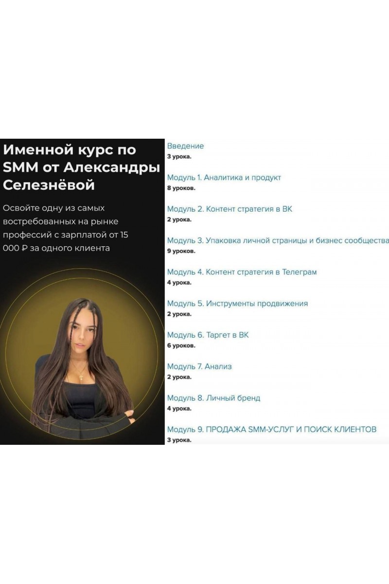 Освойте одну из самых востребованных на рынке профессий с зарплатой от 15 000 ₽ за одного клиентаПрограмма курса:Модуль 1. Аналитика и продуктМодуль 2. Контент стратегия в ВКМодуль 3. Упаковка личной страницыМодуль 4. Контент стратегия в ТелеграмМодуль 5. Инструменты продвиженияМодуль 6. Таргет в ВКМодуль 7. АнализМодуль 8. Личный брендМодуль 9. Продажа SMM услуг