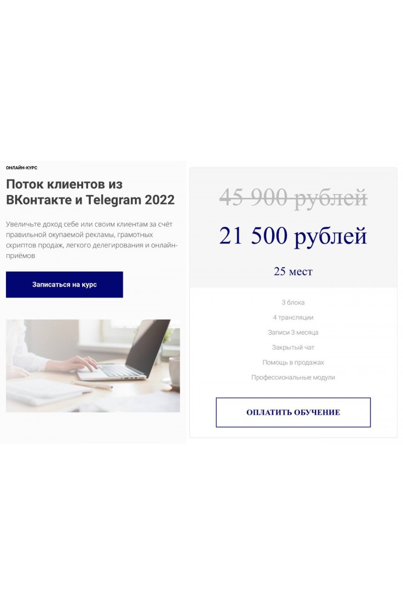 Получите продюсера, маркетолога, методиста, ментора и таргетологаКогда инстаграм закрыли и многие блогеры перетекли в телеграм и ВК, все теперь равны. Я серьезно. Только вчера мне рассказали, как из инстаграма со 120000 подписчиками - в ВК перешло всего 4000. По сути, сейчас так или иначе все оказались на одном уровне.И это значит только одно: это ваш идеальный шанс начать свое продвижение прямо сейчас.Благодаря курсу “Поток клиентов из ВКонтакте и Telegram 2022” Вы:- Проработаете личные убеждения и поставите цели, которые вас мотивируют и зажигают;- Научитесь получать новых учеников в Instagram по самой выгодной стоимости;- Узнаете, что такое бизнес-модель и рассчитаете её по шаблону, чтобы было рентабельно;- Запустите управляемый «Сарафанный маркетинг» без вложений;- Составите чек-лист для существенного уменьшения стоимости рекламы;- Узнаете секреты, «как продавать, не продавая»;- Подготовите аккаунт к запуску рекламы, чтобы защититься от блокировок или знать план действий по их отключению в случае случайных блокировок ВКонтакте и Telegram;- Протестируете основные виды рекламы во Вконтакте, чтобы найти самый лучший для себя — видео, лид-формы, сообщения в директ с шаблонами, комментарии;- Сделаете самостоятельно креативы с нашей помощью, которые будут работать и приносить потенциальных клиентов;- Узнаете, как на одном ученике зарабатывать больше, чтобы у вас всегда были деньги на рекламу и привлечение новых учеников.Получите продюсера, маркетолога, методиста, ментора и таргетолога