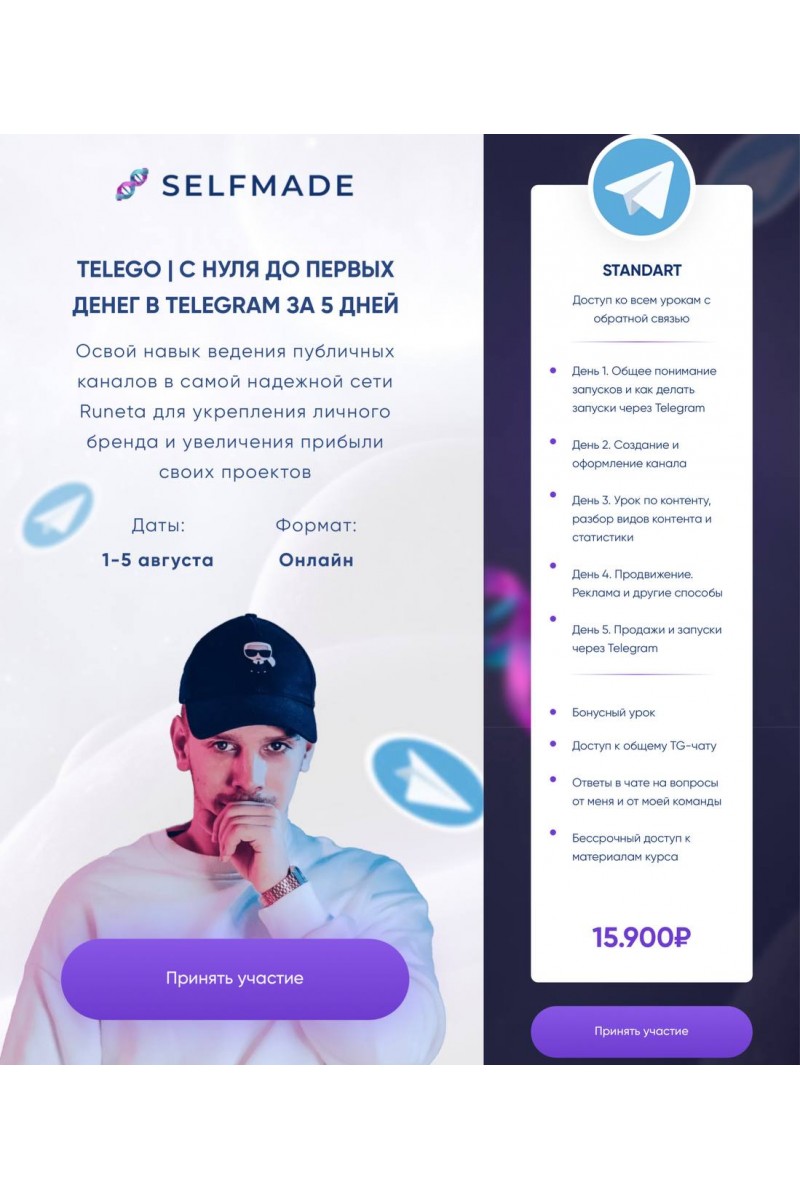 Освой навык ведения публичных каналов в самой надежной сети Runeta для укрепления личного бренда и увеличения прибыли своих проектов.ПРОГРАММАДень 1ОБЩЕЕ ПОНИМАНИЕ ЗАПУСКОВ И КАК ДЕЛАТЬ ЗАПУСКИ ЧЕРЕЗ TELEGRAM– Запуск как система– Особенности запуска через Telegram– Отличия от запусков в других социальных сетях– Преимущества Telegram– Функционал мессенджера, который вы сможете применить на своем запускеРезультат:Спроектируете свой запуск через Telegram и получите полное понимание, как делать запуски через данную платформу.День 2СОЗДАНИЕ И ОФОРМЛЕНИЕ КАНАЛА – Как создать и оформить свой канал?– Какие виды каналов бывают? (приватные, по подписке, открытые). Что выбрать для максимального результата?– Базовые правила упаковки– Как оформить рабочий профиль и для чего он нужен?– Полезные фишки, чтобы выделиться– Расширенные возможности Telegram PremiumРезультат:Создадите и правильно упакуете свой канал, подготовив его к публикации контента, закупу рекламы и продажам.День 3УРОК ПО КОНТЕНТУ, РАЗБОР ВИДОВ КОНТЕНТА И СТАТИСТИКА– Какой бывает контент?– Моя персональная контент-стратегия и как ее применять– Приемы для повышения охватов и вовлеченности аудитории– Статистика канала: куда смотреть и на что обращать внимание– Что такое «стоимость поста»?Результат:Заполните контентную таблицу, благодаря которой у вас больше не возникнет вопроса «О чем писать?», научитесь работать со статистикой и аудиторией.День 4ПРОДВИЖЕНИЕ, РЕКЛАМА И ДРУГИЕ СПОСОБЫ– Как выбирать каналы для рекламы?– Какой сервис выбрать для закупки рекламы– На что обращать внимание при анализе каналов– Как оценивать стоимость и ожидаемый приход подписчиков– Как взаимодействовать с админами каналов– Какими должны быть рекламные подачи– Бесплатные методы продвиженияРезультат:Научитесь продвигать свой канал и привлекать подписчиков, которые будут действительно заинтересованы, а не просто подписаны на вас.День 5ПРОДАЖИ И ЗАПУСКИ В ТЕЛЕГРАМ– Как выбрать подходящий метод продаж?– Формат продающего мероприятия– Продажи в основном блоге– Продажи в отдельном каналеРезультат:Сможете сделать свой первый запуск через Telegram.МАТЕРИАЛЫ– Подборка хорошо оформленных каналов и профилей– Контент-таблица для запуска на шестизначные суммы– Пак примеров по рекламным подачам– Инструкция по работе с Telemetr– Прототип воронки продаж