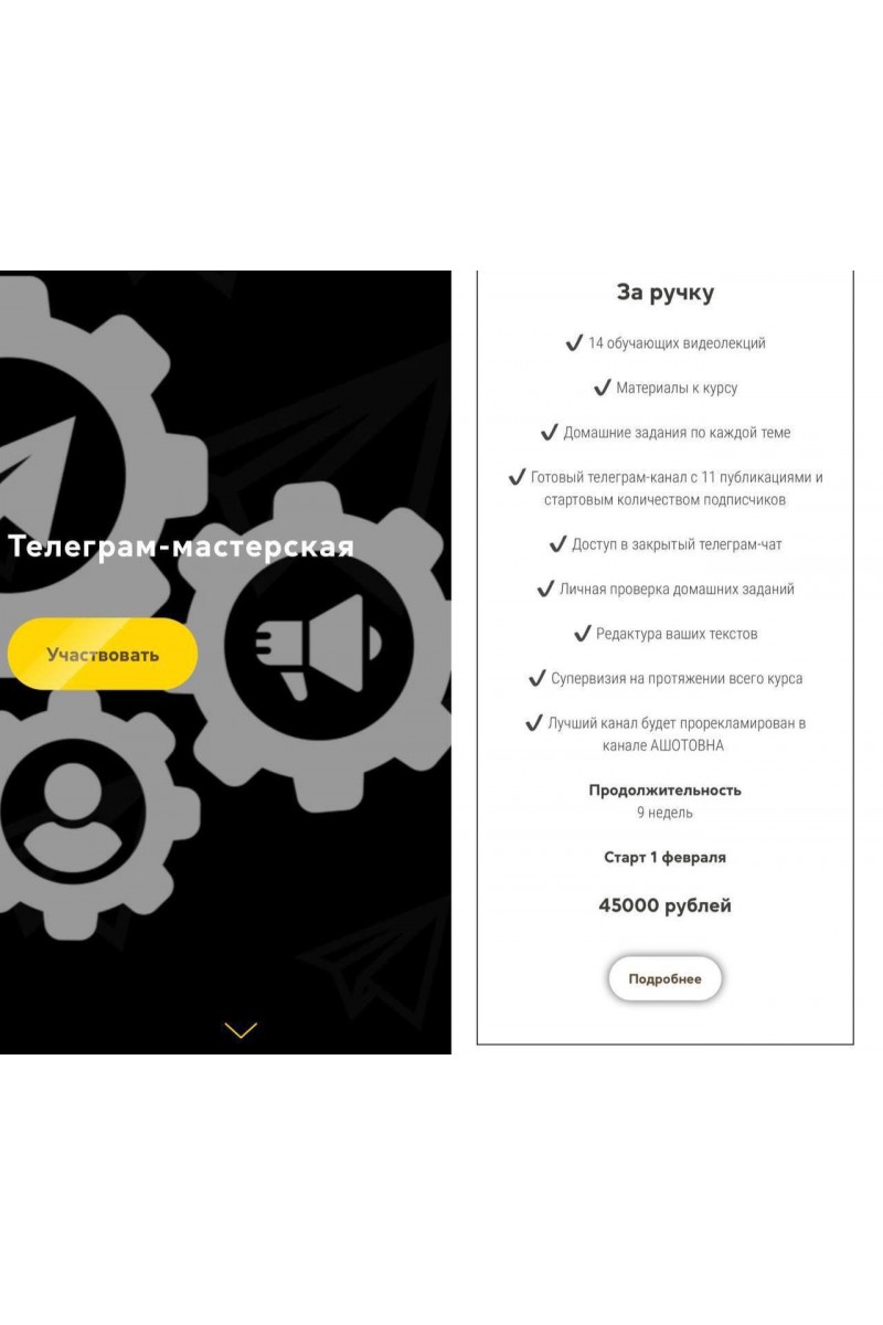 Телеграм-мастерская Ануш Манасян (автор телеграм-канала "Ашотовна" более 31 тысячи подписчиков)Этот курс для тех, кто хочет создать и вести популярный телеграм-канал на любую тему, чтобы зарабатывать, обрести популярность и развить творческий потенциал.Если вы хотите писать как я или круче меня, хотите иметь свой собственный стиль и слог, хотите на этом зарабатывать и обрести популярность, значит этот курс для вас.Вы будете писать так, что ваши тексты будут читать и перечитывать. Рекламодатели будут ломиться каждый день, а вы будете воротить нос (это будни всех владельцев популярных телеграм-каналов).Программа курса1 неделя "Упаковка"Концепция канала.Название и описание.Приветственный пост.Выбор жанра.2 неделя "Конструкции"Структура эссе.Структура лонгрида.Структура короткого текста.Структура продающего текста.3 неделя "Приемы"Стилистические приемы (метафоры, аллегории, аллюзии).Юмор, драма, ирония, эмоции.Ритм и динамика.Ликвидация графомании.4 неделя "Конвейер"Вы каждый день пишите тексты на заданные темы, чтобы освоить ремесло и создать привычку писать. Это самая тяжелая неделя, но после нее вы запишите легко и с большой долей кайфа.Бонус: видеолекция о продвижении канала.12 видео - лекцийКаждая лекция длится 20 минут и состоит из подробного разбора текущей темы темы.Домашние заданияКаждое задание направлено на практическое применение и освоение материала курса.Материалы курсаТекстовые материалы для углубленного изучения, чек-листы по каждой видеолекции.Чат в телеграмЗакрытая среда для поддержки и общения в процессе обучения.