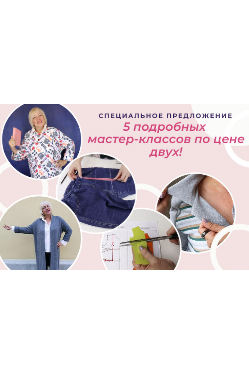 Очень выгодное предложение! (Не верите – посчитайте!)В комплекте:МК «Цельнокроенный рукав»МК «Кардиган из трикотажа»МК «Снятие выкройки с готовых изделий»МК «Корректировка готовых выкроек»МК «10 вариантов обработки горловины»Бонусы