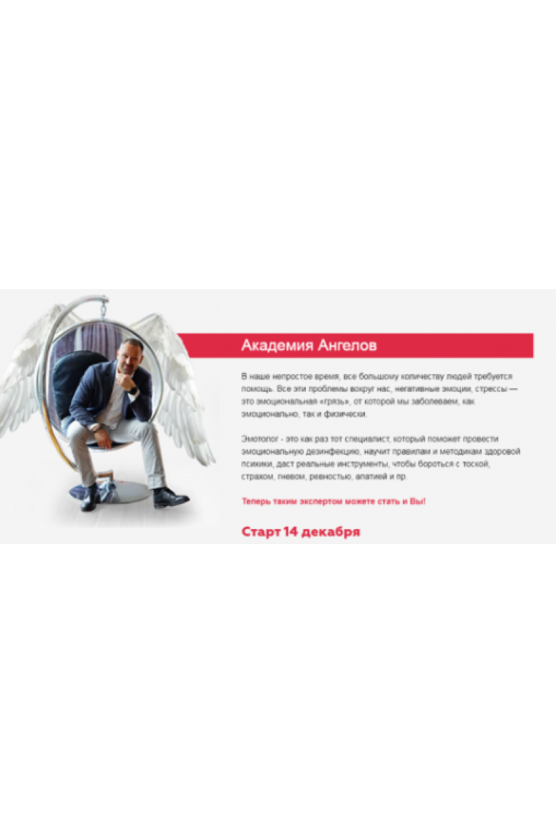 Эмотолог – не психолог, у него узкая специализация – работа с эмоциями. Так как очень много людей страдают от негативных эмоций каждый день, то эмотолог как ангел-хранитель будет спасать людей от негатива. Поэтому я назвал этот проект Академия Ангелов – чистых, светлых, позитивных людей, которые помогают другим бороться с негативом.