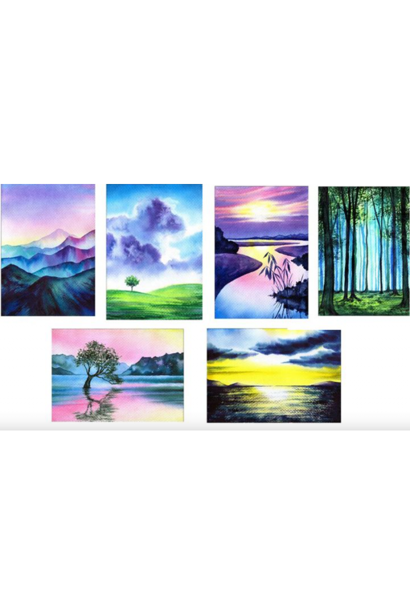 В этих уроках мы будем рисовать очень акварельные волшебные горы и рассветное атмосферное небо над ними, закатное небо над морем и контрастные блики на морской глади, таинственный лес и дымку тумана, нежный пейзаж с озером, пышные акварельные облака над бескрайним полем, вечернее солнце над тихой рекой, все это за счет переливов и перетеков краски по мокрой бумаге с помощью интересной цветовой палитры.