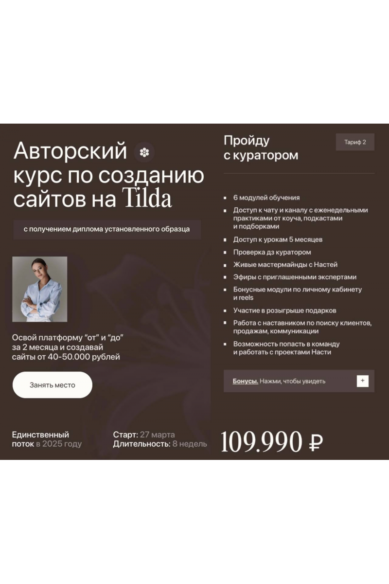 Ключевая цель обучения — дать вам сильный и конкурентный навык, собрать портфолио из 1−3 работ на Tilda на реальных проектах и выйти на стабильный доход от 50−100.000 рублей/месяц на дизайне