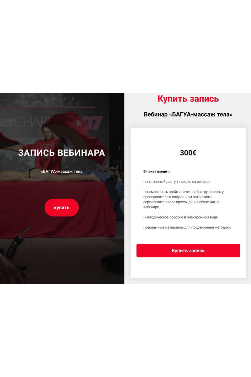 Особенности вебинара: Самый популярный и востребованный семинар Александра Ермолаева Высокое качество обучения Съемка и онлайн трансляция высокого разрешения с «эффектом присутствия» ученика и предельная информационная детализация каждого приема,как и огромный опыт преподавателя позволяют с успехом освоить материал даже новичкам в массаже Советы и рекомендации по продвижению методики На вебинаре будут озвучены советы и рекомендации по максимально быстрому продвижению продаж методики вашим клиентам Востребованность методики Методика отлично продается и востребована во многих элитных салонах красоты Москвы, России и Зарубежья Создания уникальных, не имеющих аналогов тандем-массажей Возможность создания уникальных, не имеющих аналогов тандем-массажей, имеющих высокий коммерческий спрос на современном развивающемся рынке России и Зарубежья. Великолепная финансовая отдача от методики Красота, гармония, эстетичность и экзотика, новизна и великолепная финансовая отдача от методики Создание широкого спектра СПА процедур - Возможность создания после прохождения обучения широкого спектра СПА процедур, которые будут 100% востребованы вашими клиентами Описание Методики: Состояние БАЛАНСА Постоянное развитие Тай-Цзи Более чем 200 уникальных приемов Тонизация мышц, снятие напряжения, регуляция обмена веществ, повышение иммунитета Работа с «подсознанием» клиента - постоянный доступ к видео на сервере - возможность пройти зачет и обратную связь у преподавателя с получением авторского сертификата после прохождения обучения на вебинаре - методическое пособие в электронном виде - рекламные материалы для продвижения методики