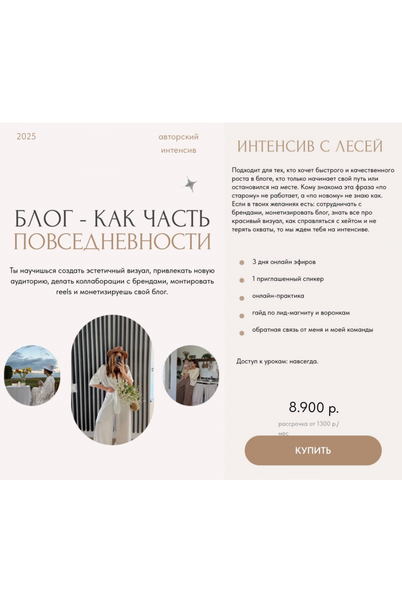 Подходит для тех, кто хочет быстрого и качественного роста в блоге, кто только начинает свой путь или остановился на месте. Кому знакома эта фраза «по старому» не работает, а «по новому» не знаю как. Если в твоих желаниях есть: сотрудничать с брендами, монетизировать блог, знать все про красивый визуал, как справляться с хейтом и не терять охваты, то мы ждем тебя на интенсиве.