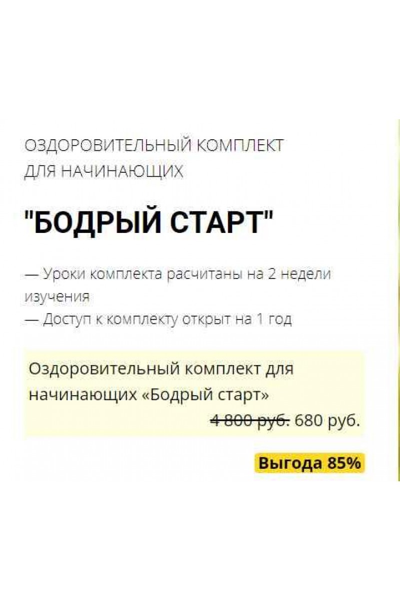 Мы собрали для вас специальный оздоровительный комплект для начинающих "Бодрый старт" — это 17 видео, 3 книги и 8 видео-уроков