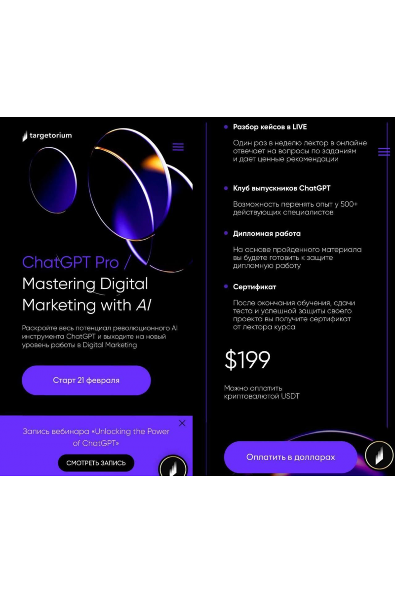 Курс для digital-специалистов, которые хотят прокачать свои навыки с помощью ChatGPT. Благодаря нему вы научитесь правильно брифовать клиента, создавать эффективные запросы в ChatGPT и сможете увеличить свою продуктивность в 10 раз.