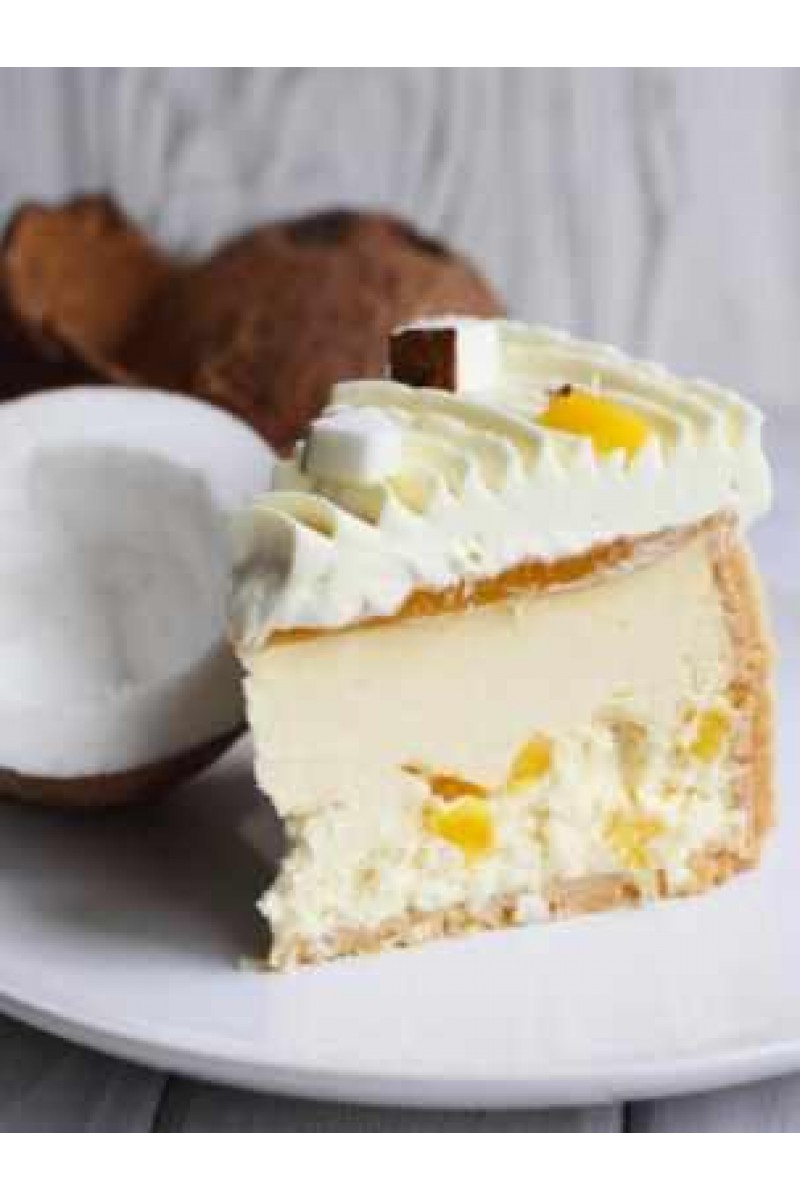 Хрустящая песочная основа с добавлением кокосовой муки и масла, сырный слой с мякотью свежего кокоса, кусочки ананаса, сырный слой со вкусом ананаса и добавлением ликёра «Пина колада», ананасовый гель и взбитый ганаш на белом шоколаде с ликером «Пина колада».