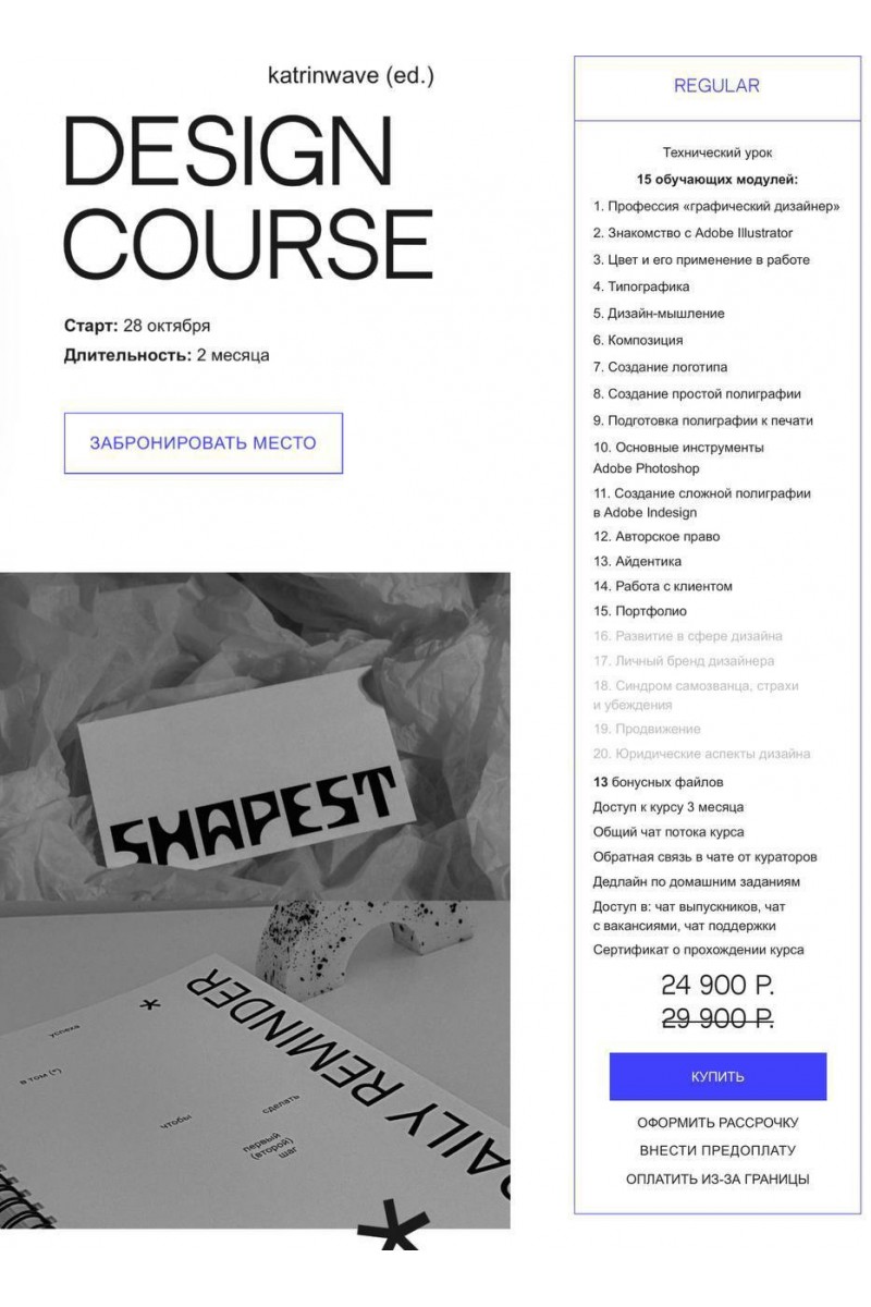 Осознанный дизайн — курс для тех, кто хочет научиться создавать дизайн не по шаблону1. Профессия «графический дизайнер»2. Знакомство с Adobe Illustrator3. Цвет и его применение в работе4. Типографика5. Дизайн-мышление6. Композиция7. Создание логотипа8. Создание простой полиграфии9. Подготовка полиграфии к печати10. Основные инструменты Adobe Photoshop11. Создание сложной полиграфиив Adobe Indesign12. Авторское право13. Айдентика14. Работа с клиентом16. Развитие в сфере дизайна15. Портфолио