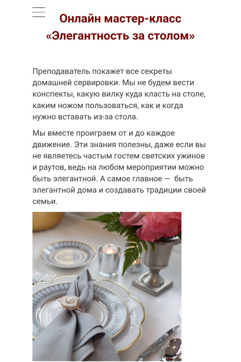 Мы вместе с вами проиграем от и до каждое движение за столом. Поэтому этот вебинар можно смотреть вместе со всей семьей. Эти знания полезны, даже если вы не являетесь частым гостем светских ужинов и раутов, ведь на любом мероприятии можно быть элегантной.