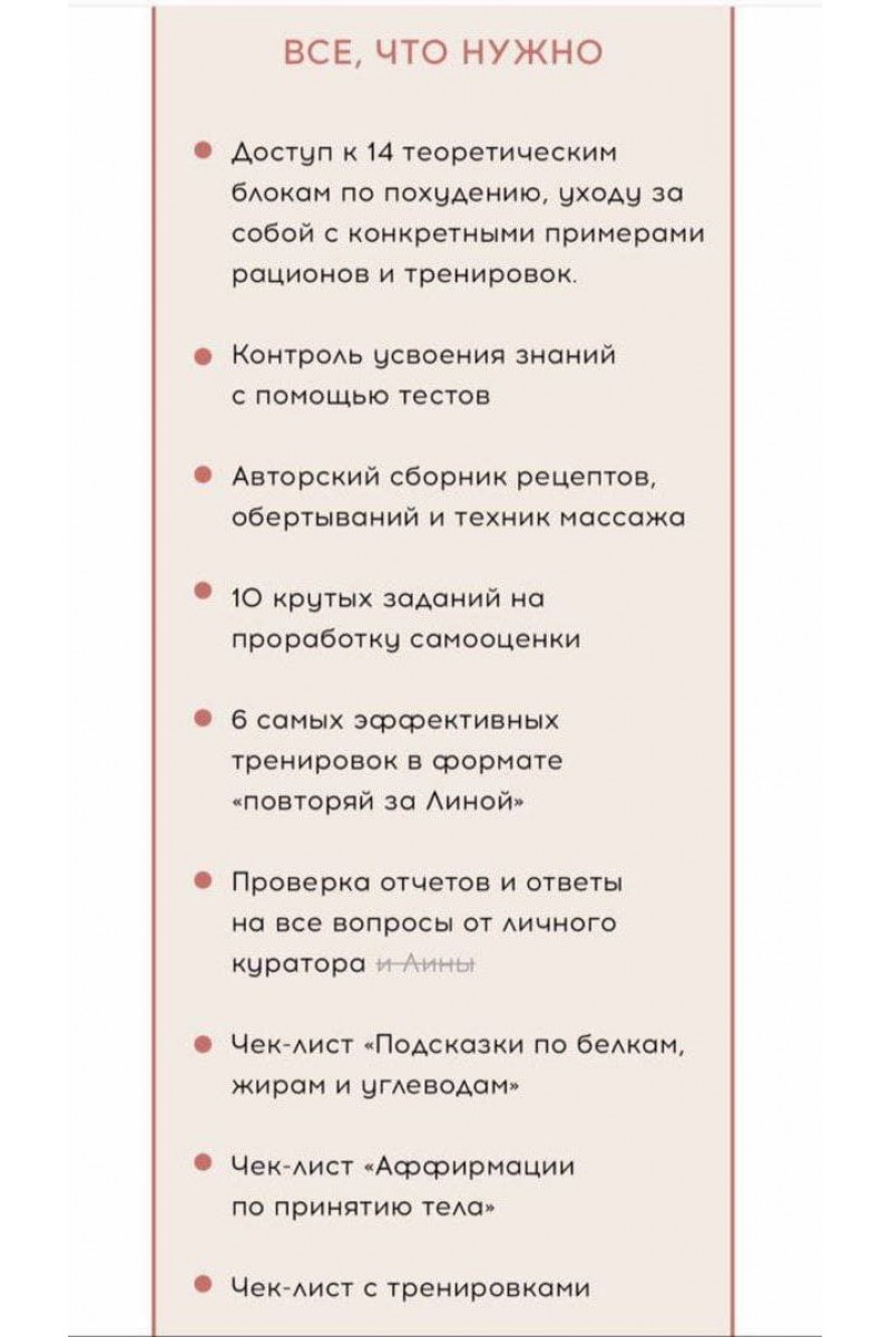 КУРС ПО ПОХУДЕНИЮ, ПИТАНИЮ И ЛЮБВИ К СЕБЕ ДЛЯ ВАС, ЕСЛИ:- Вы хотите похудеть с помощью здорового и работающего метода- У вас есть пищевые расстройства и проблемы с питанием- Вам надоели откаты, хочется постоянного результата- Вы хотите достичь своего идеала- Вы хотите работать над созданием стройного и красивого тела без ущерба для здоровьяЧТО ТЕБЯ ЖДЕТ НА КУРСЕМодуль 1. Почему мы худеем?Модуль 2. Все о белках, жирах и углеводах.Модуль 3. Примеры готовых рационов. Гликемический индекс.Модуль 4. Эмоциональный и психологический голод.Модуль 5. Расстройства пищевого поведения.Модуль 6. Почему диеты не работают? Мифы о питании.Модуль 7. Переедания.Модуль 8. Питание и спорт во время критических дней.Модуль 9. Работа над самооценкой.Модуль 10. Целлюлит. Причины возникновения. Как уменьшить количество целлюлита в теле?Модуль 11. Почему дефицит калорий работает?Модуль 12. Как не поправиться после дефицита калорий?Модуль 13. Отеки. Восстановление после тренировки.Модуль 14. Подведение итогов. Финальные замеры.