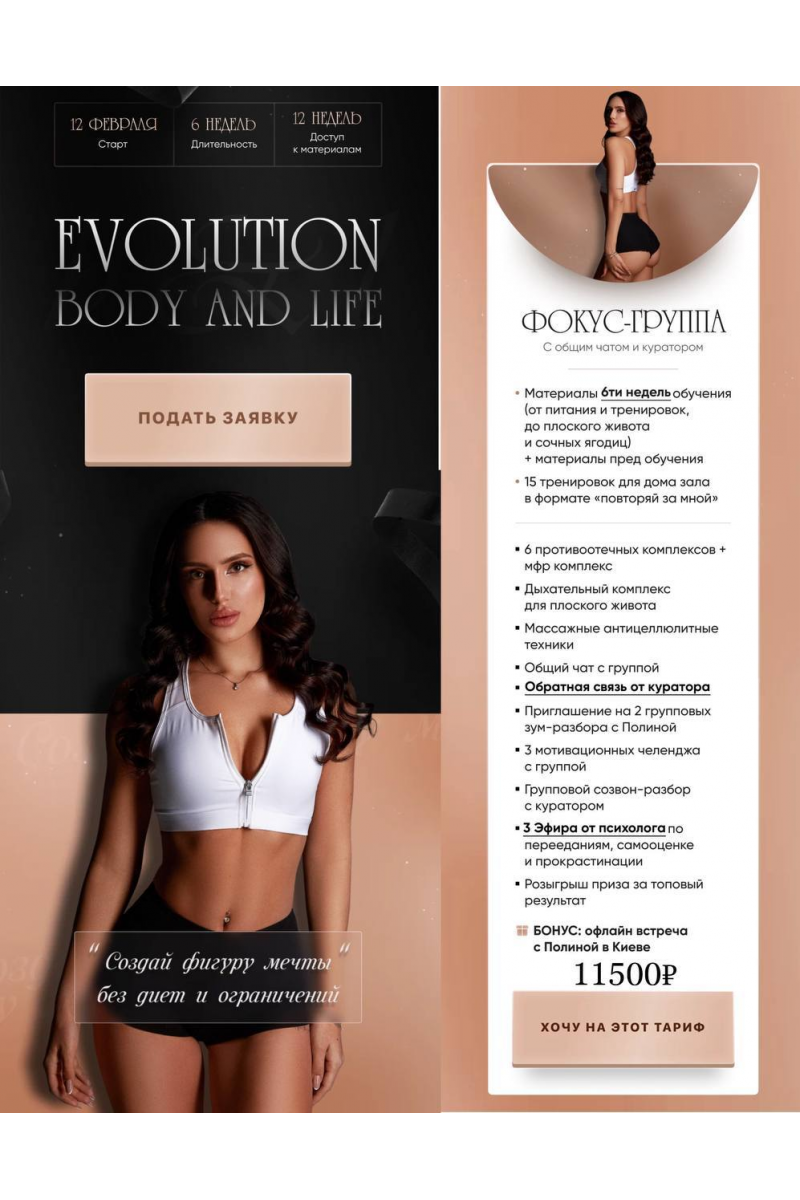 Программа курса:ПредобучениеНеделя 1. Меняем только питаниеНеделя 2. Добавляем тренировкиНеделя 3. Добавляем противоотечные комплексыНеделя 4. Плоский животНеделя 5. ЯгодицыНеделя 6. Целлюлит