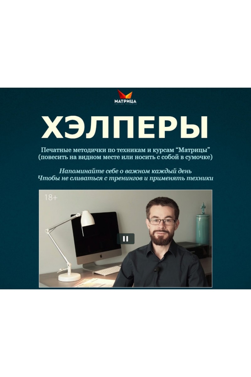 16 хэлперов одним большим комплектом: “Скейпинг”, “Родитель - Ребенок”, “Связь с реальностью - Контакт с собой”, “Принцип Зеркала”, “(Без)Денежные Привычки”, “АнтиКризис”, “АнтиСаботаж”, “Личная Финансовая Система”, “Стратегия Жизни”, “Градиент Матрицы”, “Градиент: Кросскультурность”, “Градиент: Области Жизни”, “Градиентные Отношения: Мужчина”, “Градиентные Отношения: Женщина”, “Карта иллюзий: Деньги”, “Карта иллюзий: Отношения”.