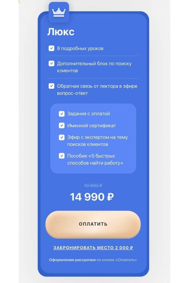 8 подробных уроковДополнительный блок по поиску клиентовОбратная связь от лектора в эфиреВопрос-ответЗадания с оплатойИменной сертификатЭфир с экспертом на тему поисков клиентовПособие - 5 быстрых способов найти работу