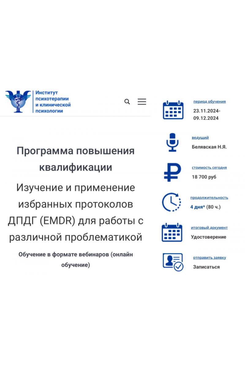 - Изучение и применение избранных протоколов ДПДГ, EMDR для работы с различной проблематикой. Наталия Белявская