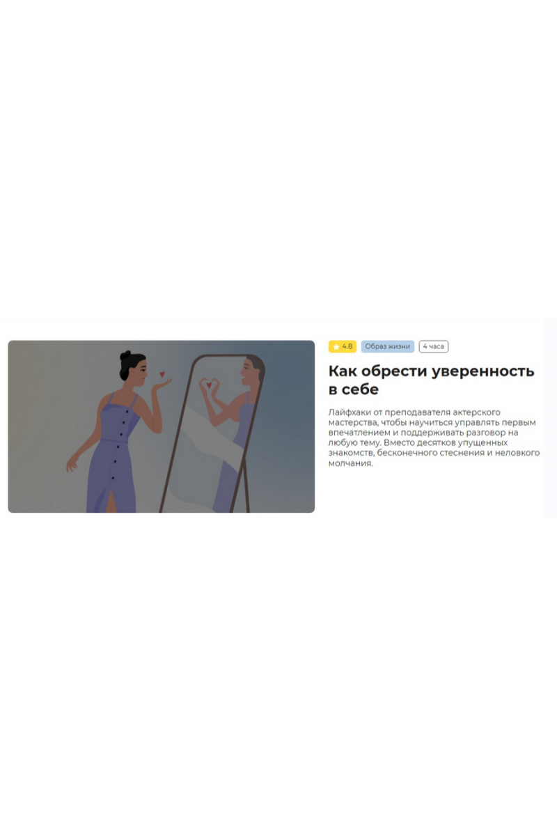 Сначала вы изучите внутренние и внешние барьеры, которые препятствуют уверенности. Затем проанализируете, как изменить восприятие себя с помощью мышления и развития телесности (работа с осанкой, спорт и др.). Дальше узнаете, как справляться со стрессом при публичных выступлениях и чувствовать себя свободно в новых компаниях. После каждого теоретического блока — выполните техники, которые помогут закрепить полученные знания и стать более раскрепощенным.