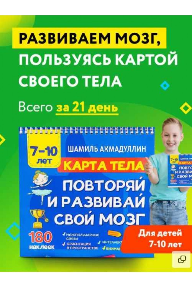 Родители обычно много времени уделяют развитию интеллекта ребенка, забывая о тесной связи мозга с телом. Этот тренажер от Шамиля Ахмадуллина - психолога, педагога, физика, разработчика более 40 методик эффективного обучения детей, основателя школ скорочтения и развития памяти у детей - разработан специально для школьников 7-10 лет и отлично подходит как для отдельных занятий, так и для перерывов в выполнении домашних заданий. В блокноте-тренажере вы найдете простые движения, которые развивают у ребенка восприятие схемы тела (карты тела), тренируют межполушарные взаимодействия, внимание память, улучшают координацию и ориентацию в пространстве, благоприятно влияют на мышление и речь. Система мотивации в виде наклеек, их более 180, сделают занятия интересными и эффективными!